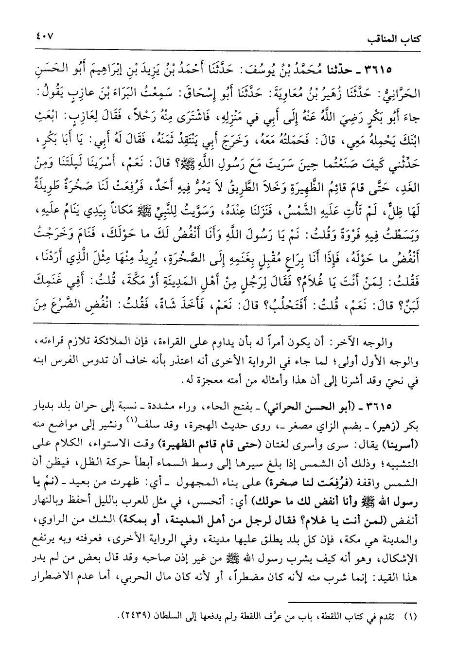 3615 - (أبو الحسن الحراني) -بفتح الحاء، وراء مشددة- نسبة إلى حران بلد بديار بكر (زهير) -بضم الزاي مصغر-، روى حديث الهجرة، وقد سلف ونشير إلى مواضع منه (أسرينا) يقال: سرى وأسرى لغتان (حتى قام قائم الظهيرة) وقت الاستواء، الكلام على التشبيه؛ وذلك أن الشمس إذا بلغ سيرها إلى وسط السماء أبطأ حركة الظل، فيظن أن الشمس واقفة (فرُفِعَت لنا صخرة) على بناء المجهول -أي: ظهرت من بعيد- (نمْ يا رسول الله - صلى الله عليه وسلم - وأنا أنفض لك ما حولك) أي: أتحسس، في مثل للعرب بالليل أحفظ وبالنهار أنفض (لمن أنت يا غلام؟ فقال لرجل من أهل المدينة، أو بمكة) الشك من الراوي، والمدينة هي مكة، فإن كل بلد يطلق عليها مدينة، وفي الرواية الأخرى، فعرفته وبه يرتفع الإشكال، وهو أنه كيف يشرب رسول الله - صلى الله عليه وسلم - من غير إذن صاحبه وقد قال بعض من لم يدر هذا القيد: إنما شرب منه لأنه كان مضطرًا، أو لأنه كان مال الحربي، أما عدم الاضطرار