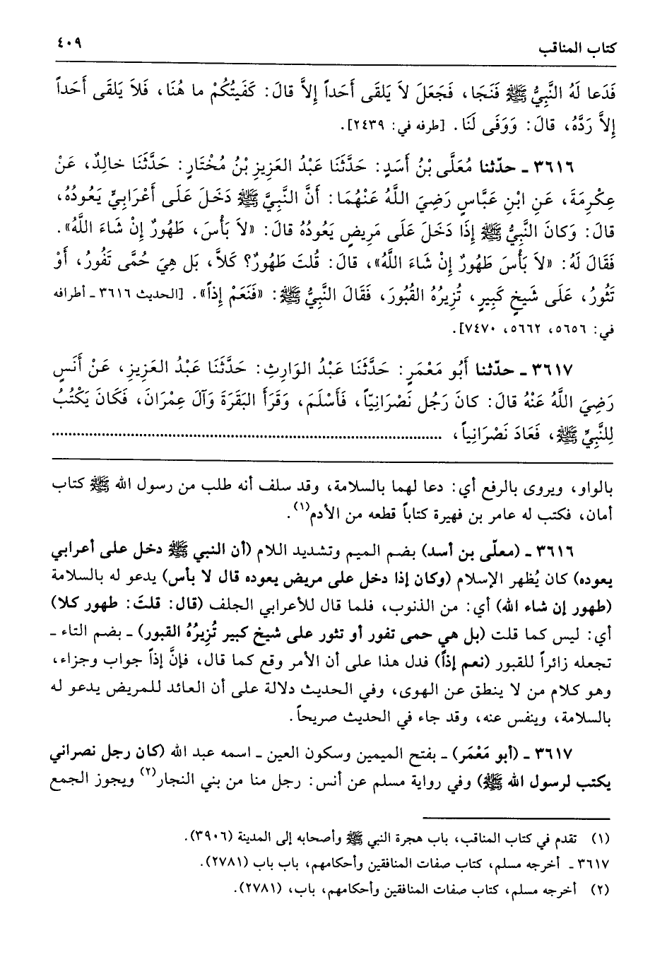 3616 - (معلّى بن أسد) بضم الميم وتشديد اللام (أن النبي - صلى الله عليه وسلم - دخل على أعرابي يعوده) كان يُظهر الإسلام (وكان إذا دخل على مريض يعوده قال لا بأس) يدعو له بالسلامة (طهور إن شاء الله) أي: من الذنوب، فلما قال للأعرابي الجلف (قال: قلتَ: طهور كلا) أي: ليس كما قلت (بل هي حمى تفور أو تثور على شيخ كبير تُزِيرُهُ القبور) -بضم التاء- تجعله زائرًا للقبور (نعم إذًا) فدل هذا على أن الأمر وقع كما قال، فإنَّ إذًا جواب وجزاء، وهو كلام من لا ينطق عن الهوى، وفي الحديث دلالة على أن العائد للمريض يدعو له بالسلامة، وينفس عنه، وقد جاء في الحديث صريحًا.