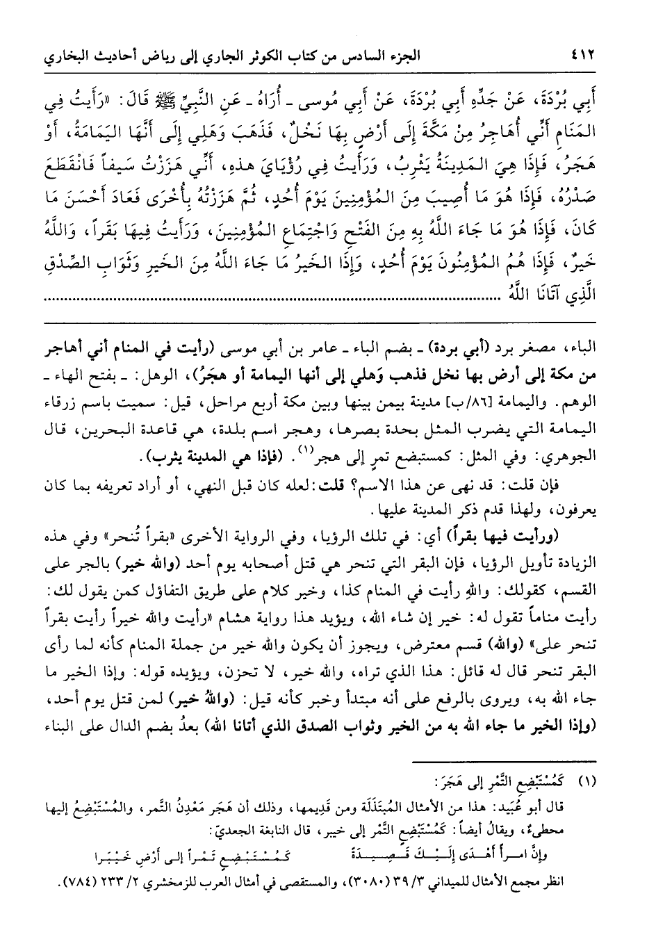 الباء، مصغر برد (أبي بردة) -بضم الباء- عامر بن أبي موسى (رأيت في المنام أني أهاجر من مكة إلى أرض بها نخل فذهب وَهلي إلى أنها اليمامة أو هجَرُ)، الوهل: -بفتح الهاء- الوهم. واليمامة مدينة بيمن بينها وبين مكة أربع مراحل، قيل: سميت باسم زرقاء اليمامة التي يضرب المثل بحدة بصرها، وهجر اسم بلدة، هي قاعدة البحرين، قال الجوهري: وفي المثل: كمستبضع تمرٍ إلى هجر. (فإذا هي المدينة يثرب).
