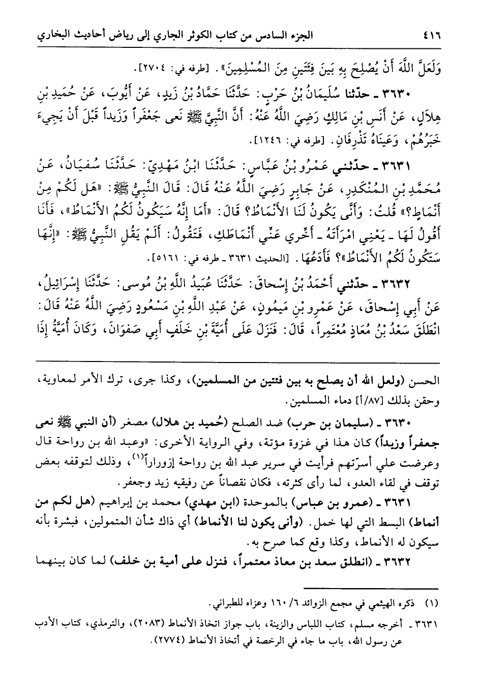 3630 - (سليمان بن حرب) ضد الصلح (حُميد بن هلال) مصغر (أن النبي - صلى الله عليه وسلم - نعى جعفرًا وزيدًا) كان هذا في غزوة مؤتة، وفي الرواية الأخرى: "وعبد الله بن رواحة قال وعرضت علي أسرّتهم فرأيت في سرير عبد الله بن رواحة إزورارًا، وذلك لتوقفه بعض توقف في لقاء العدو، لما رأى كثرته، فكان نقصانًا عن رفيقيه زيد وجعفر.