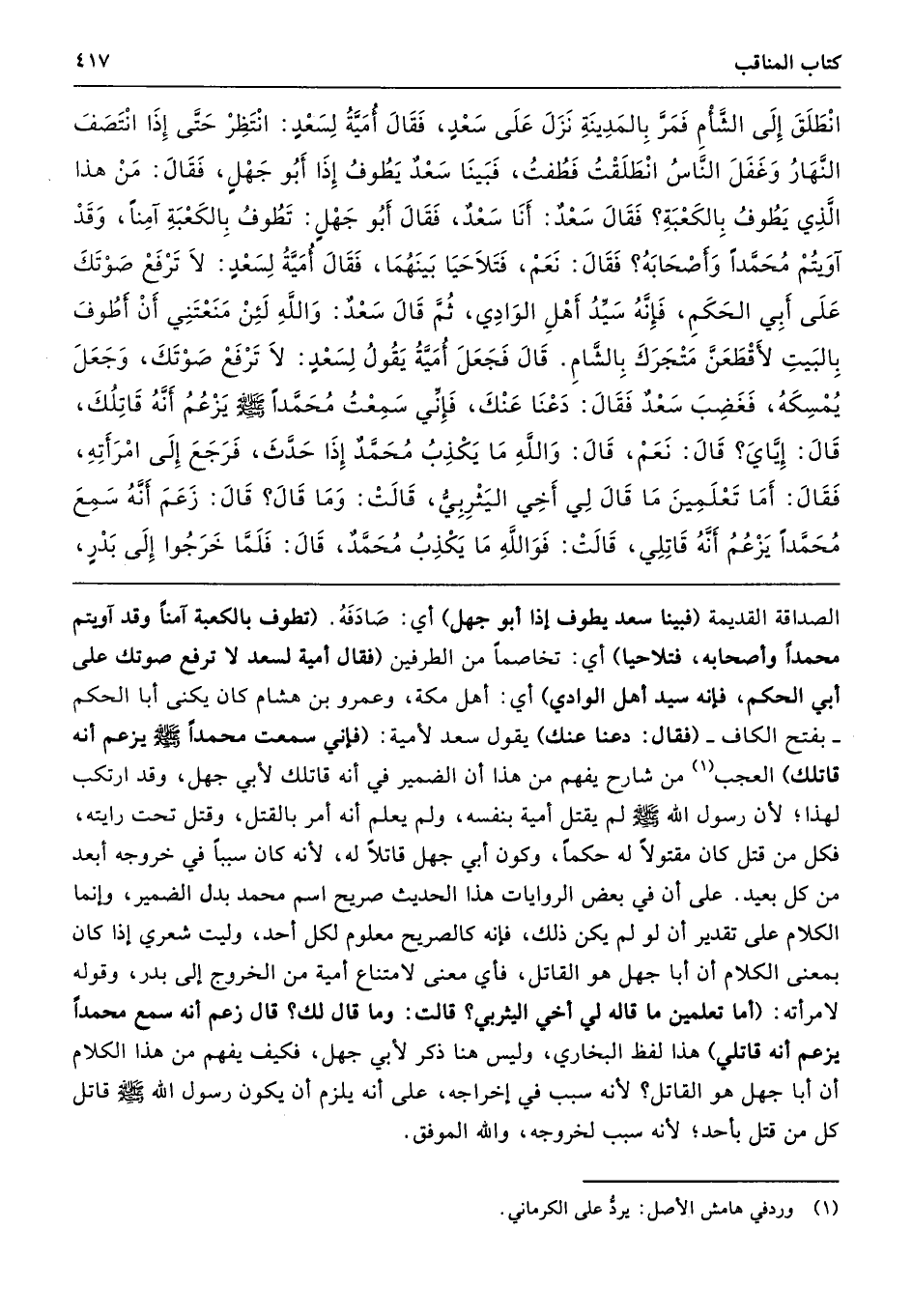 الصداقة القديمة (فبينا سعد يطوف إذا أبو جهل) أي: صَادَفَهُ. (تطوف بالكعبة آمنًا وقد آويتم محمدًا وأصحابه، فتلاحيا) أي: تخاصمًا من الطرفين (فقال أمية لسعد لا ترفع صوتك على أبي الحكم، فإنه سيد أهل الوادي) أي: أهل مكة، وعمرو بن هشام كان يكنى أبا الحكم -بفتح الكاف - (فقال: دعنا عنك) يقول سعد لأمية: (فإني سمعت محمدًا - صلى الله عليه وسلم - يزعم أنه قاتلك) العجب من شارح يفهم من هذا أن الضمير في أنه قاتلك لأبي جهل، وقد ارتكب لهذا؛ لأن رسول الله - صلى الله عليه وسلم - لم يقتل أمية بنفسه، ولم يعلم أنه أمر بالقتل، وقتل تحت رايته، فكل من قتل كان مقتولًا له حكمًا، وكون أبي جهل قاتلًا له، لأنه كان سببًا في خروجه أبعد من كل بعيد. على أن في بعض الروايات هذا الحديث صريح اسم محمد بدل الضمير، وإنما الكلام على تقدير أن لو لم يكن ذلك، فإنه كالصريح معلوم لكل أحد، وليت شعري إذا كان بمعنى الكلام أن أبا جهل هو القاتل، فأي معنى لامتناع أمية من الخروج إلى بدر، وقوله لامرأته: (أما تعلمين ما قاله لي أخي اليثربي؟ قالت: وما قال لك؟ قال زعم أنه سمع محمدًا يزعم أنه قاتلي) هذا لفظ البخاري، وليس هنا ذكر لأبي جهل، فكيف يفهم من هذا الكلام أن أبا جهل هو القاتل؟ لأنه سبب في إخراجه، على أنه يلزم أن يكون رسول الله - صلى الله عليه وسلم - قاتل كل من قتل بأحد؛ لأنه سبب لخروجه، والله الموفق.