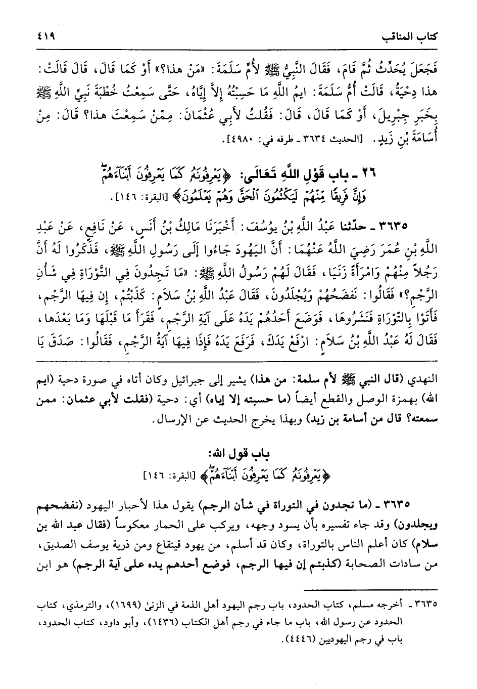 باب قول الله: {يَعْرِفُونَهُ كَمَا يَعْرِفُونَ أَبْنَاءَهُمْ} [البقرة: 146]