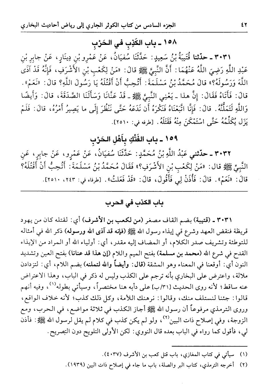 3031 - (قتيبة) بضم القاف مصغر (من لكعب بن الأشرف) أي: لقتله كان من يهود قريظة فنقض العهد وشرع في إيذاء رسول الله - صلى الله عليه وسلم - (فإنه قد آذى الله ورسوله) ذكر الله في أمثاله للتوطئة وتشريف صدر الكلام، أو المضاف إليه مقدر، أي: أولياء الله أو المراد من الإيذاء القدح في شرع الله (محمَّد بن مسلمة) بفتح الميم والسلام (إن هذا قد عنانا) بفتح العين وتشديد النون أي: أوقعنا في المعناء وهو المشقة (قال: وأيضًا والله لتملنه) بضم اللام، أي: لتزدادن ملالة، واعترض على البخاري بأنه ترجم على الكذب وليس له ذكر في الباب، وهذا الاعتراض عنه ساقط؛ لأنه روى الحديث على دأبه هنا مختصرًا، وسيأتي بطوله، وفيه أنهم قالوا: جئنا لنستلف منك، وقالوا: نرهنك اللأمة، وكل ذلك كذب؛ لأنه خلاف الواقع، وروى الترمذي مرفوعًا أن رسول الله - صلى الله عليه وسلم - أجاز الكذب في ثلاثة مواضع، في الحرب، ومع الزوجة، وفي إصلاح ذات البين، ولو لم يكن كذب في كلام لم يقل لرسول الله - صلى الله عليه وسلم -: فأذن لي، فأقول كما رواه في الباب بعده قال النووي: لكن الأولى التلويح دون التصريح.
