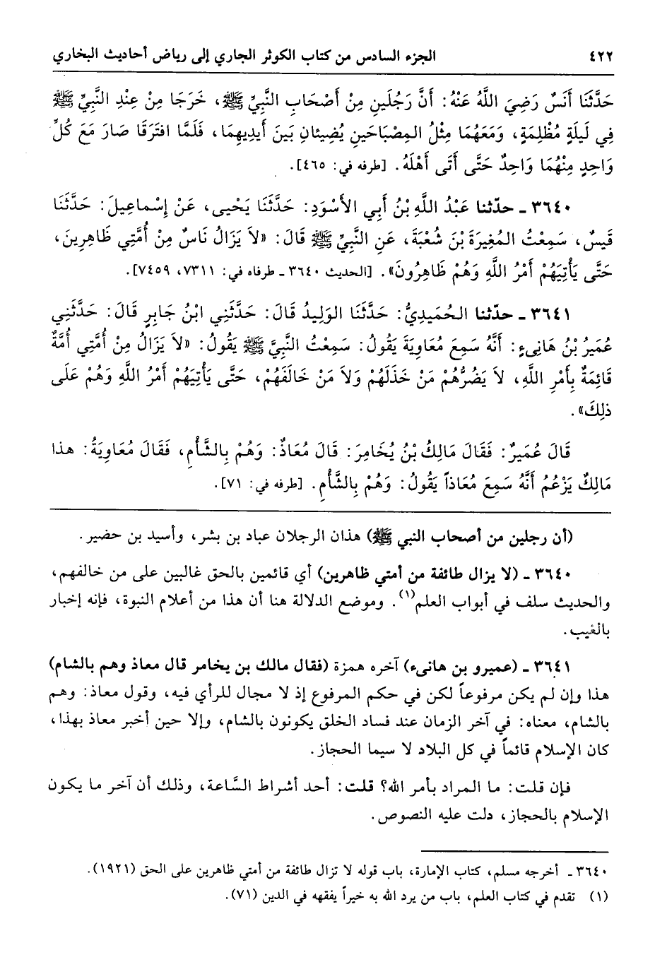 3641 - (عمرو بن هانئ) آخره همزة (فقال مالك بن يخامر قال معاذ وهم بالشام) هذا وإن لم يكن مرفوعًا لكن في حكم المرفوع إذ لا مجال للرأي فيه، وقول معاذ: وهم بالشام، معناه: في آخر الزمان عند فساد الخلق يكونون بالشام، وإلا حين أخبر معاذ بهذا، كان الإسلام قائمًا في كل البلاد لا سيما الحجاز.