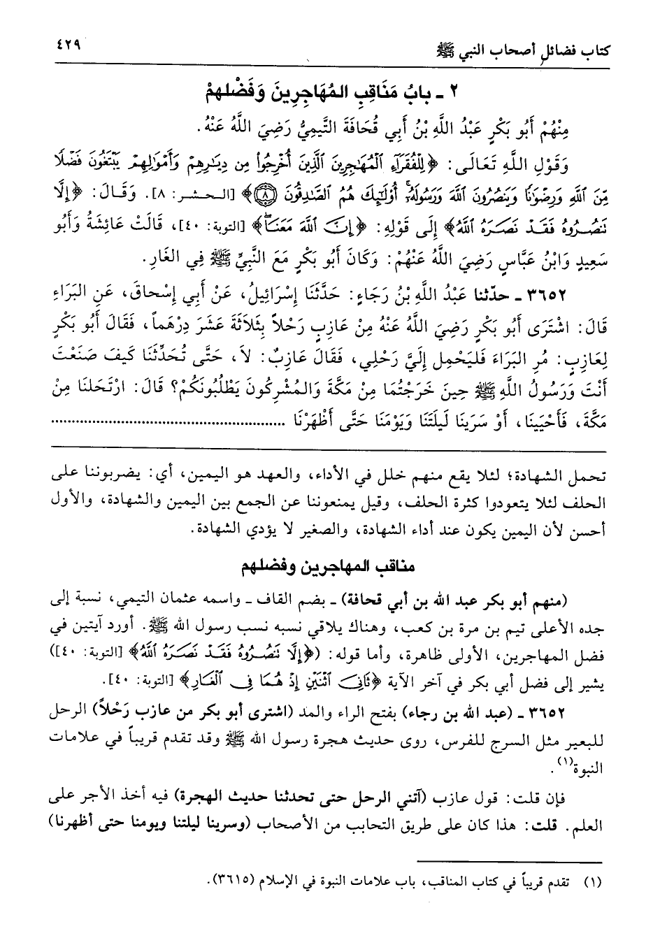 3652 - (عبد الله بن رجاء) بفتح الراء والمد (اشترى أبو بكر من عازب رَحْلًا) الرحل للبعير مثل السرج للفرس، روى حديث هجرة رسول الله - صلى الله عليه وسلم - وقد تقدم قريبًا في علامات النبوة.
