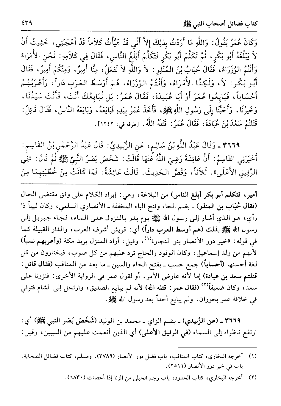 3669 - وَقَالَ عَبْدُ اللَّهِ بْنُ سَالِمٍ عَنِ الزُّبَيْدِىِّ قَالَ عَبْدُ الرَّحْمَنِ بْنُ الْقَاسِمِ أَخْبَرَنِى الْقَاسِمُ أَنَّ عَائِشَةَ - رضى الله عنها - قَالَتْ شَخَصَ بَصَرُ النَّبِيِّ - صلى الله عليه وسلم - ثُمَّ قَالَ «فِي الرَّفِيقِ الأَعْلَى». ثَلاَثًا، وَقَصَّ الْحَدِيثَ، قَالَتْ فَمَا كَانَتْ مِنْ خُطْبَتِهِمَا مِنْ