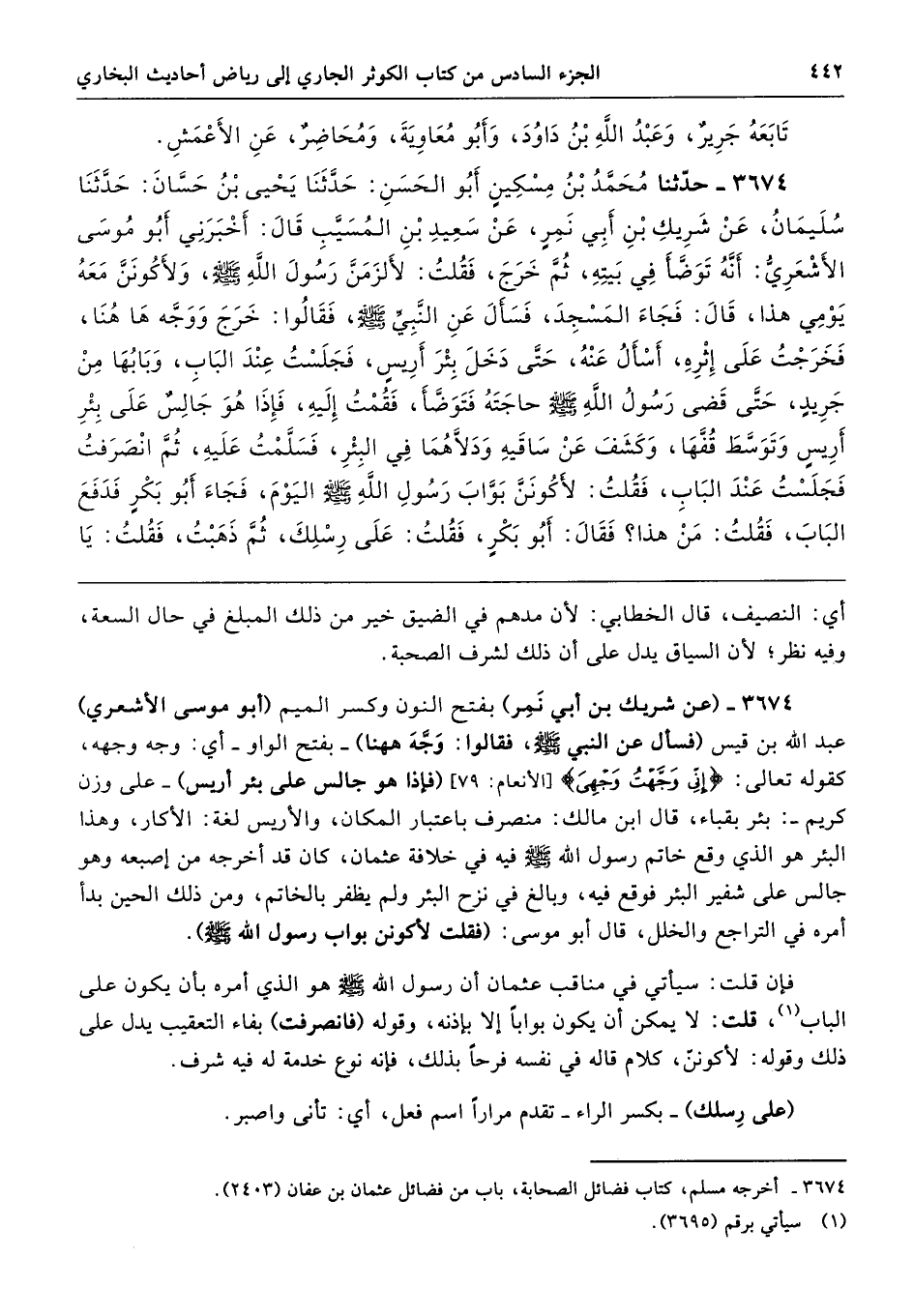 3674 - (عن شريك بن أبي نَمِر) بفتح النون وكسر الميم (أبو موسى الأشعري) عبد الله بن قيس (فسأل عن النبي - صلى الله عليه وسلم -، فقالوا: وَجَّهَ ههنا) -بفتح الواو- أي: وجه وجهه، كقوله تعالى: {إِنِّي وَجَّهْتُ وَجْهِيَ} [الأنعام: 79] (فإذا هو جالس على بئر أريس) -على وزن كريم-: بئر بقباء، قال ابن مالك: منصرف باعتبار المكان، والأريس لغة: الأكار، وهذا البئر هو الذي وقع خاتم رسول الله - صلى الله عليه وسلم - فيه في خلافة عثمان، كان قد أخرجه من إصبعه وهو جالس على شفير البئر فوقع فيه، وبالغ في نزح البئر ولم يظفر بالخاتم، ومن ذلك الحين بدأ أمره في التراجع والخلل، قال أبو موسى: (فقلت لأكونن بواب رسول الله - صلى الله عليه وسلم -).