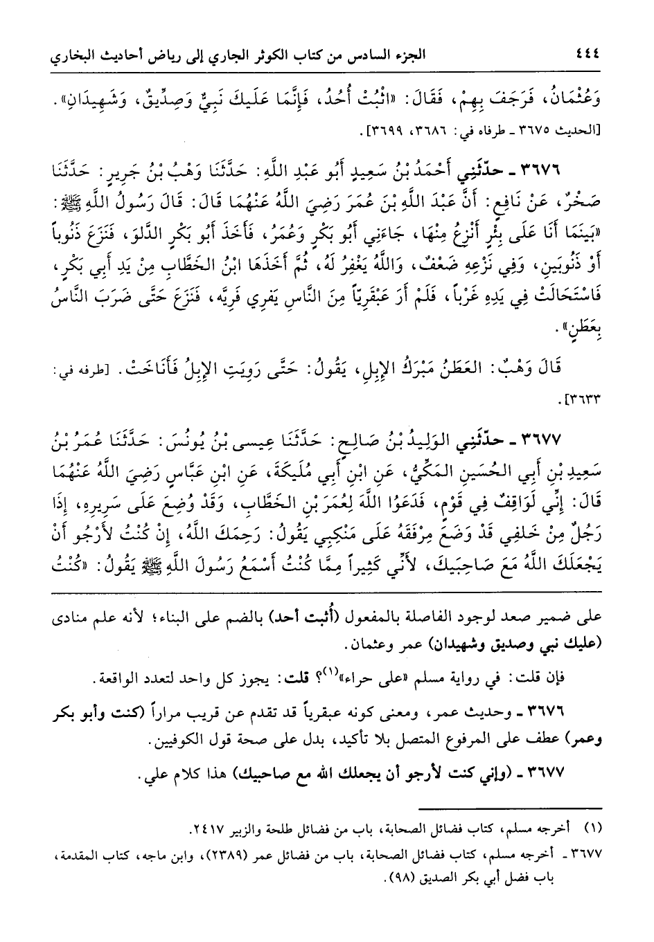 3676 - وحديث عمر، ومعنى كونه عبقريًّا قد تقدم عن قريب مرارًا (كنت وأبو بكر وعمر) عطف على المرفوع المتصل بلا تأكيد، بدل على صحة قول الكوفيين.