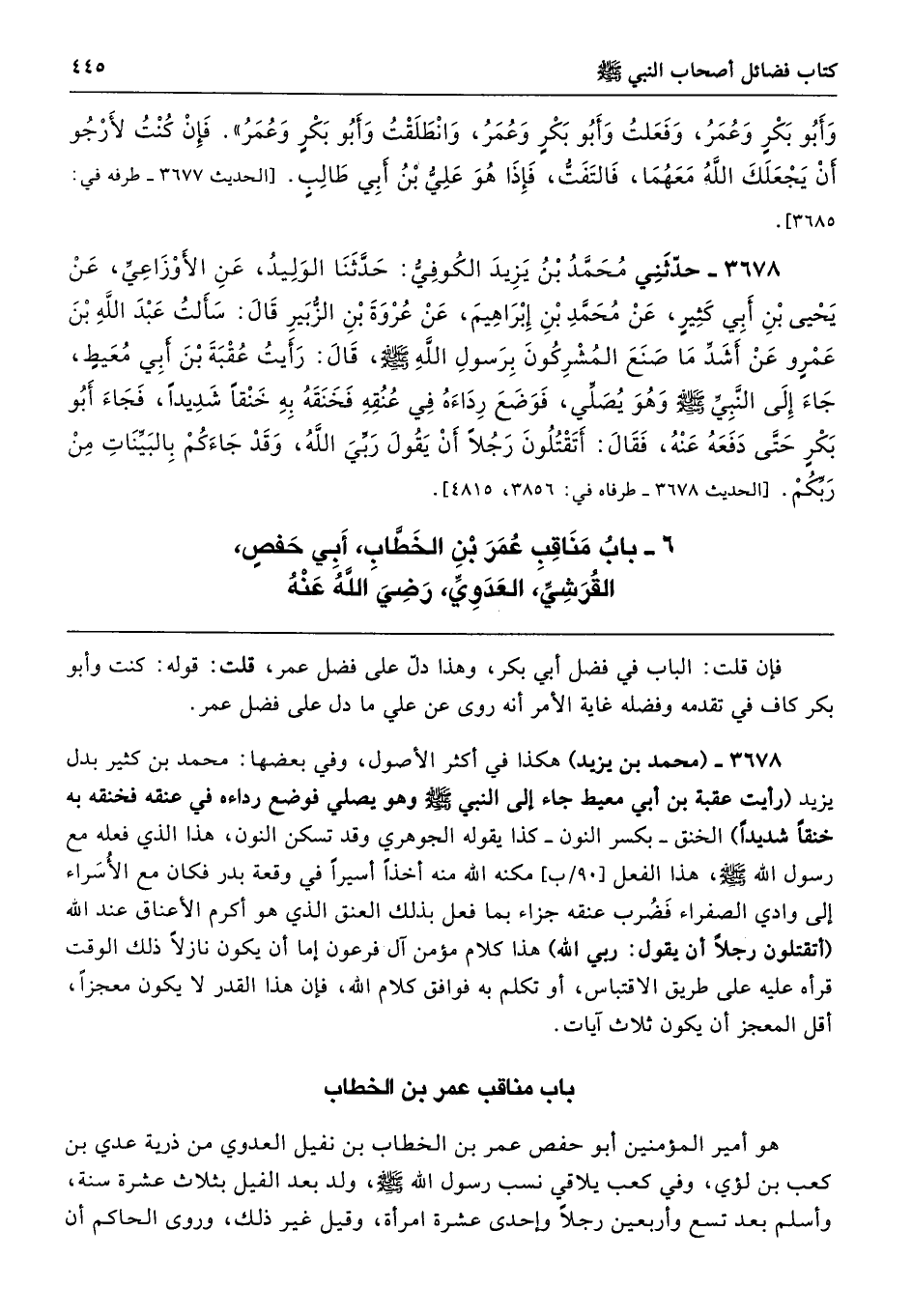 3678 - (محمد بن يزيد) هكذا في أكثر الأصول، وفي بعضها: محمد بن كثير بدل يزيد (رأيت عقبة بن أبي معيط جاء إلى النبي - صلى الله عليه وسلم - وهو يصلي فوضع رداءه في عنقه فخنقه به خنقًا شديدًا) الخنق -بكسر النون- كذا يقوله الجوهري وقد تسكن النون، هذا الذي فعله مع رسول الله - صلى الله عليه وسلم -، هذا الفعل مكنه الله منه أخذًا أسيرًا في وقعة بدر فكان مع الأُسَراء إلى وادي الصفراء فَضُرب عنقه جزاء بما فعل بذلك العنق الذي هو أكرم الأعناق عند الله (أتقتلون رجلًا أن يقول: ربي الله) هذا كلام مؤمن آل فرعون إما أن يكون نازلًا ذلك الوقت قرأه عليه على طريق الاقتباس، أو تكلم به فوافق كلام الله، فإن هذا القدر لا يكون معجزًا، أقل المعجز أن يكون ثلاث آيات.
