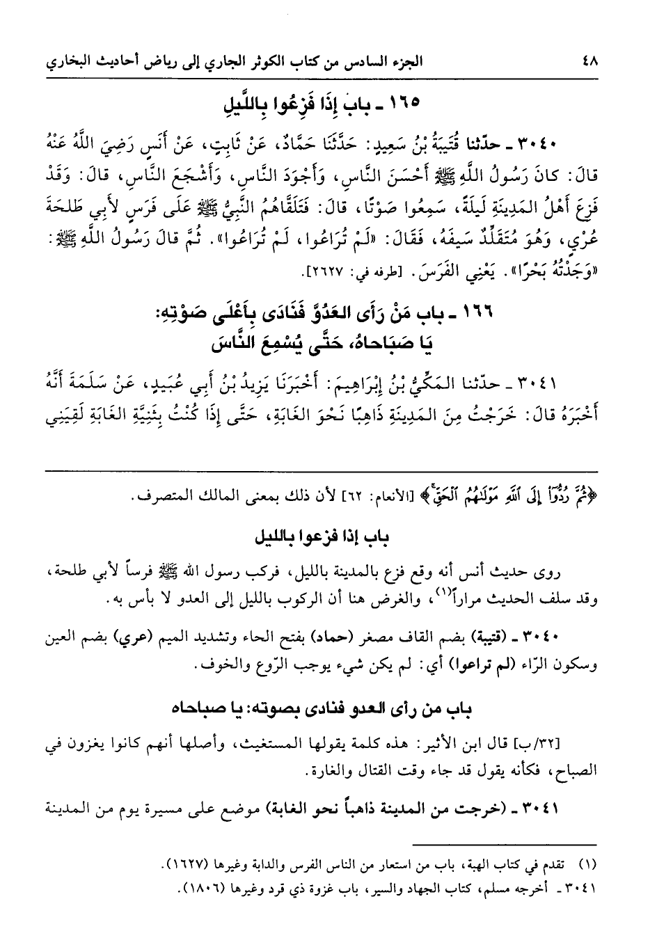 3040 - حَدَّثَنَا قُتَيْبَةُ بْنُ سَعِيدٍ حَدَّثَنَا حَمَّادٌ عَنْ ثَابِتٍ عَنْ أَنَسٍ - رضى الله عنه - قَالَ كَانَ رَسُولُ اللَّهِ - صلى الله عليه وسلم - أَحْسَنَ النَّاسِ، وَأَجْوَدَ النَّاسِ، وَأَشْجَعَ النَّاسِ، قَالَ وَقَدْ فَزِعَ أَهْلُ الْمَدِينَةِ لَيْلَةً سَمِعُوا صَوْتًا، قَالَ فَتَلَقَّاهُمُ النَّبِىُّ - صلى الله عليه وسلم - عَلَى فَرَسٍ لأَبِى طَلْحَةَ عُرْىٍ، وَهُوَ مُتَقَلِّدٌ سَيْفَهُ فَقَالَ «لَمْ تُرَاعُوا، لَمْ تُرَاعُوا». ثُمَّ قَالَ رَسُولُ اللَّهِ - صلى الله عليه وسلم - «وَجَدْتُهُ بَحْرًا». يَعْنِى الْفَرَسَ. طرفه 2627