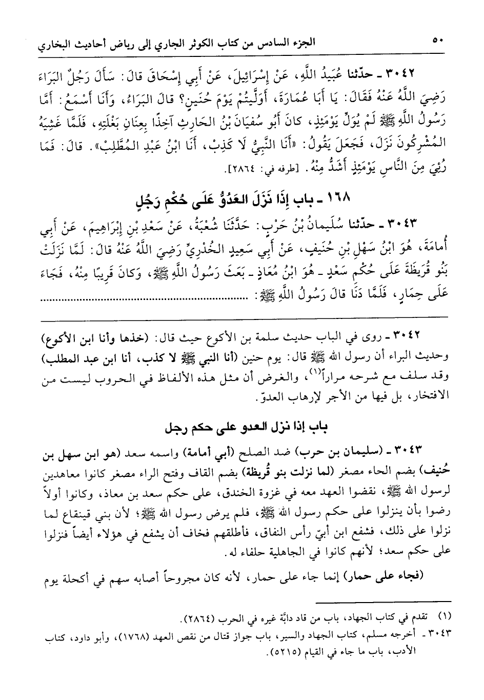 3042 - روى في الباب حديث سلمة بن الأكوع حيث قال: (خذها وأنا ابن الأكوع) وحديث الكراء أن رسول الله - صلى الله عليه وسلم - قال: يوم حنين (أنا النبي - صلى الله عليه وسلم - لا كذب، أنا ابن عبد المطلب) وقد سلف مع شرحه مرارًا، والغرض أن مثل هذه الألفاظ في الحروب ليست من الافتخار، بل فيها من الأجر لإرهاب العدوّ.