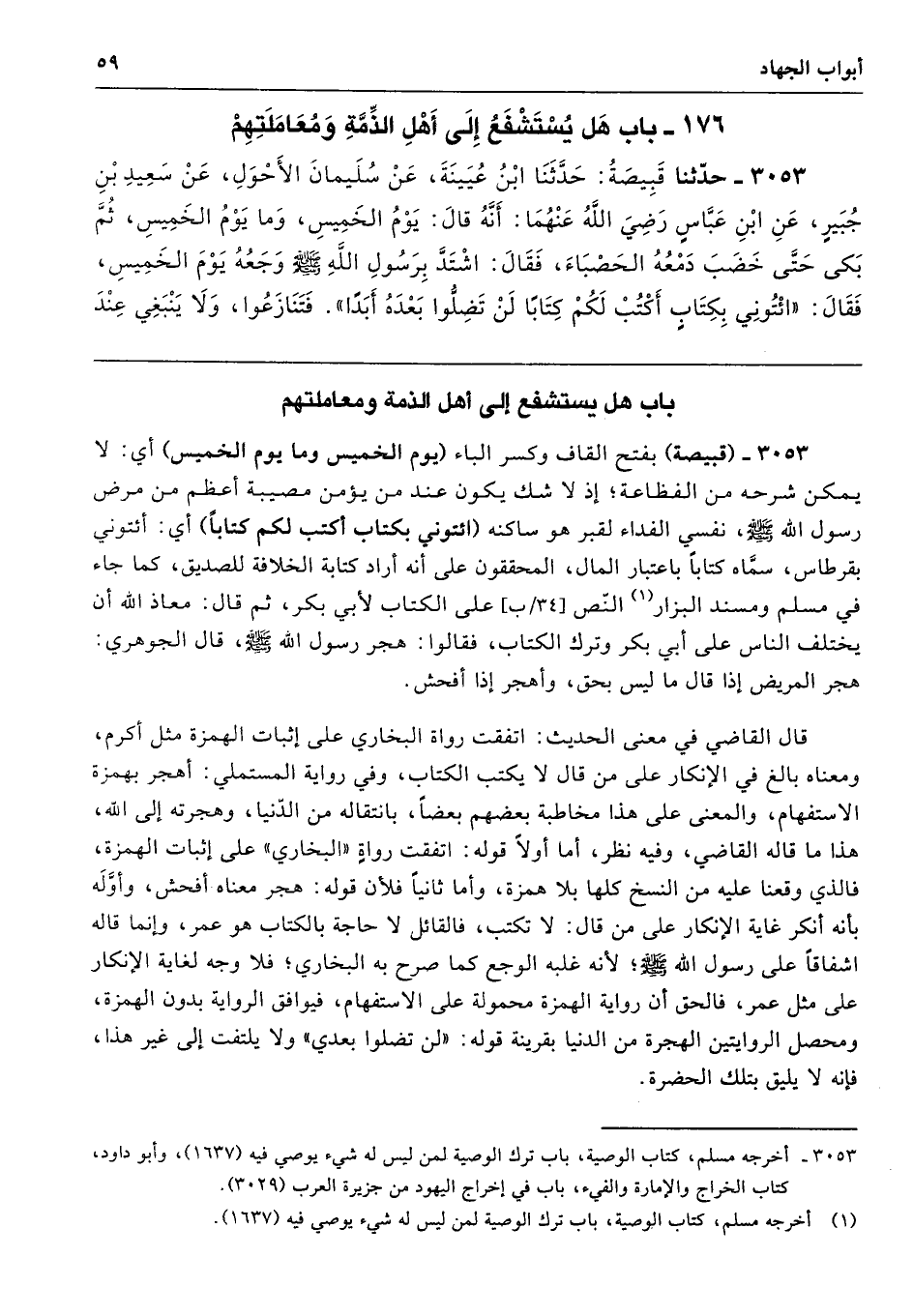 3053 - (قبيصة) بفتح القاف وكسر الباء (يوم الخميس وما يوم الخميس) أي: لا يمكن شرحه من الفظاعة؛ إذ لا شك يكون عند من يؤمن مصجة أعظم من مرض رسول الله - صلى الله عليه وسلم -، نفسي الفداء لقبر هو ساكنه (ائتوني بكتاب أكتب لكم كتابًا) أي: أئتوني بقرطاس، سمَّاه كتابًا باعتبار المال، المحققون على أنه أراد كتابة الخلافة للصديق، كما جاء في مسلم ومسند البزار النص على الكتاب لأبي بكر، ثم قال: معاذ الله أن يختلف الناس على أبي بكر وترك الكتاب، فقالوا: هجر رسول الله - صلى الله عليه وسلم -، قال الجوهري: هجر المريض إذا قال ما ليس بحق، وأهجر إذا أفحش.