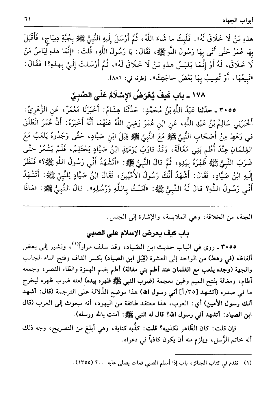 3055 - حَدَّثَنَا عَبْدُ اللَّهِ بْنُ مُحَمَّدٍ حَدَّثَنَا هِشَامٌ أَخْبَرَنَا مَعْمَرٌ عَنِ الزُّهْرِىِّ أَخْبَرَنِى سَالِمُ بْنُ عَبْدِ اللَّهِ عَنِ ابْنِ عُمَرَ - رضى الله عنهما - أَنَّهُ أَخْبَرَهُ أَنَّ عُمَرَ انْطَلَقَ فِي رَهْطٍ مِنْ أَصْحَابِ النَّبِيِّ - صلى الله عليه وسلم - مَعَ النَّبِيِّ - صلى الله عليه وسلم - قِبَلَ ابْنِ صَيَّادٍ حَتَّى وَجَدُوهُ يَلْعَبُ مَعَ الْغِلْمَانِ عِنْدَ أُطُمِ بَنِى مَغَالَةَ، وَقَدْ قَارَبَ يَوْمَئِذٍ ابْنُ صَيَّادٍ يَحْتَلِمُ، فَلَمْ يَشْعُرْ حَتَّى ضَرَبَ النَّبِىُّ - صلى الله عليه وسلم - ظَهْرَهُ بِيَدِهِ ثُمَّ قَالَ النَّبِىُّ - صلى الله عليه وسلم - «أَتَشْهَدُ أَنِّى رَسُولُ اللَّهِ - صلى الله عليه وسلم -». فَنَظَرَ إِلَيْهِ ابْنُ صَيَّادٍ فَقَالَ أَشْهَدُ أَنَّكَ رَسُولُ الأُمِّيِّينَ. فَقَالَ ابْنُ صَيَّادٍ لِلنَّبِىِّ - صلى الله عليه وسلم - أَتَشْهَدُ أَنِّى رَسُولُ اللَّهِ. قَالَ لَهُ النَّبِىُّ - صلى الله عليه وسلم - «آمَنْتُ بِاللَّهِ وَرُسُلِهِ» قَالَ النَّبِىُّ - صلى الله عليه وسلم - «مَاذَا