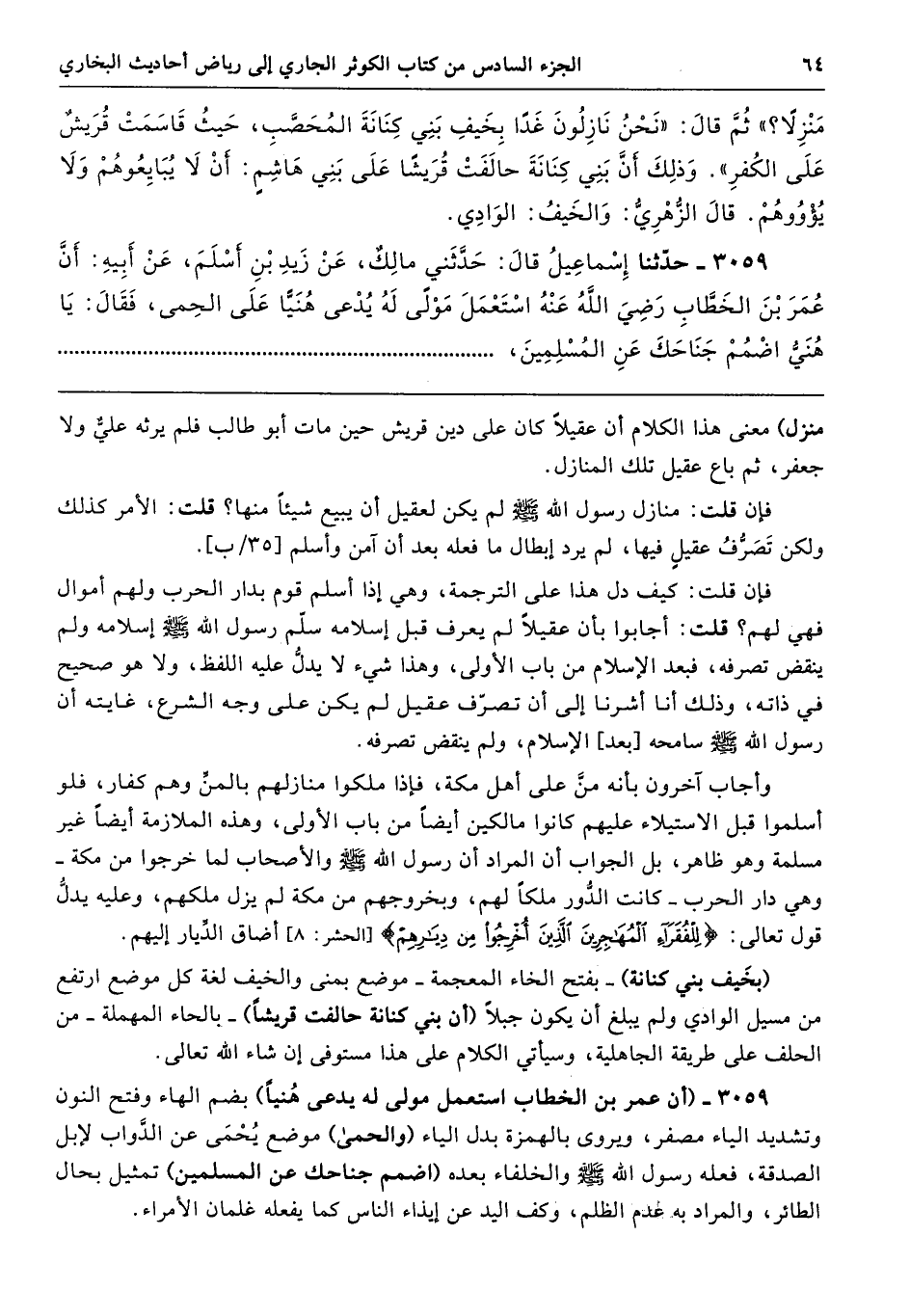 3059 - (أن عمر بن الخطاب استعمل مولى له يدعى هُنيًا) بضم الهاء وفتح النون وتشديد الياء مصفر، ويروى بالهمزة بدل الياء (والحمى) موضع يُحمَى عن الدَّواب لإبل الصدقة، فعله رسول الله - صلى الله عليه وسلم - والخلفاء بعده (اضمم جناحك عن المسلمين) تمثيل بحال الطائر، والمراد به عدم الظلم، وكف اليد عن إيذاء الناس كما يفعله غلمان الأمراء.