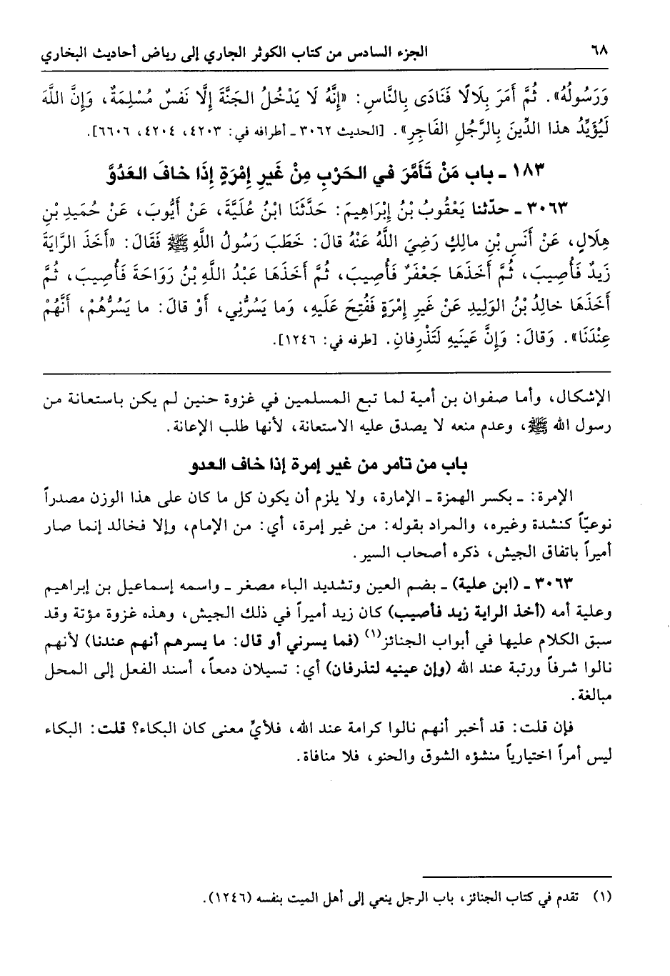 3063 - حَدَّثَنَا يَعْقُوبُ بْنُ إِبْرَاهِيمَ حَدَّثَنَا ابْنُ عُلَيَّةَ عَنْ أَيُّوبَ عَنْ حُمَيْدِ بْنِ هِلاَلٍ عَنْ أَنَسِ بْنِ مَالِكٍ - رضى الله عنه - قَالَ خَطَبَ رَسُولُ اللَّهِ - صلى الله عليه وسلم - فَقَالَ «أَخَذَ الرَّايَةَ زَيْدٌ فَأُصِيبَ، ثُمَّ أَخَذَهَا جَعْفَرٌ فَأُصِيبَ، ثُمَّ أَخَذَهَا عَبْدُ اللَّهِ بْنُ رَوَاحَةَ فَأُصِيبَ، ثُمَّ أَخَذَهَا خَالِدُ بْنُ الْوَلِيدِ عَنْ غَيْرِ إِمْرَةٍ فَفُتِحَ عَلَيْهِ، وَمَا يَسُرُّنِى - أَوْ قَالَ مَا يَسُرُّهُمْ - أَنَّهُمْ عِنْدَنَا». وَقَالَ وَإِنَّ عَيْنَيْهِ لَتَذْرِفَانِ. طرفه 1246