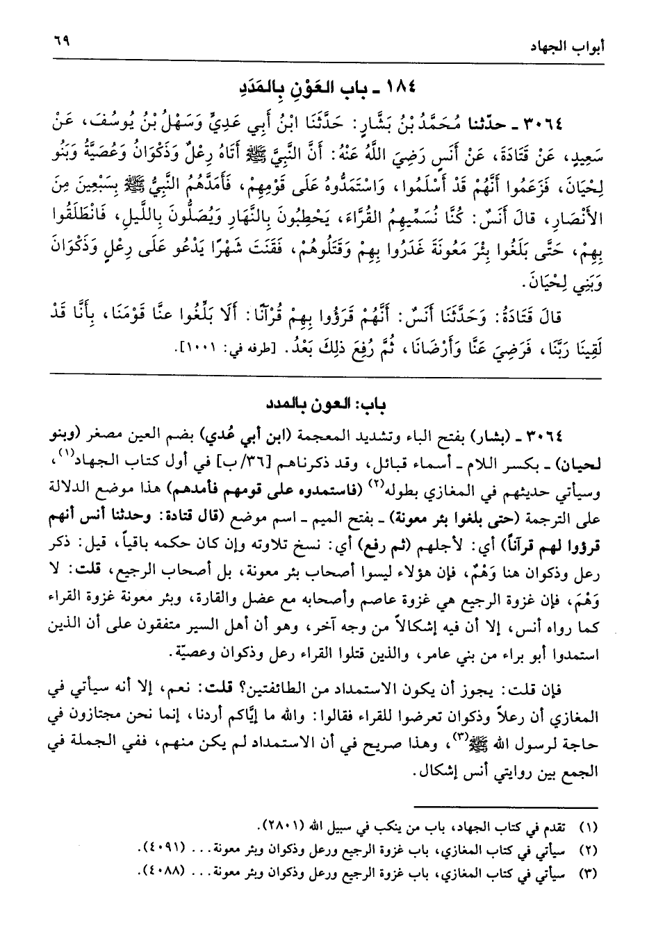 3064 - (بشار) بفتح الباء وتشديد المعجمة (ابن أبي عُدي) بضم العين مصغر (وبنو لحيان) -بكسر اللام- أسماء قبائل، وقد ذكرناهم في أول كتاب الجهاد، وسيأتي حديثهم في المغازي بطوله (فاستمدوه على قومهم فأمدهم) هذا موضع الدلالة على الترجمة (حتى بلغوا بئر معونة) -بفتح الميم- اسم موضع (قال قتادة: وحدثنا أنس أنهم قرؤوا لهم قرآنًا) أي: لأجلهم (ثم رفع) أي: نسخ تلاوته كان كان حكمه باقيًا، قيل: ذكر رعل وذكوان هنا وَهْم، فإن هؤلاء ليسوا أصحاب بئر معونة، بل أصحاب الرجيع، قلت: لا وَهْمَ، فإن غزوة الرجيع هي غزوة عاصم وأصحابه مع عضل والقارة، وبئر معونة غزوة القراء كما رواه أنس، إلا أن فيه إشكالًا من وجه آخر، وهو أن أهل السير متفقون على أن الذين استمدوا أبو براء من بني عامر، والذين قتلوا القراء رعل وذكوان وعصيّة.