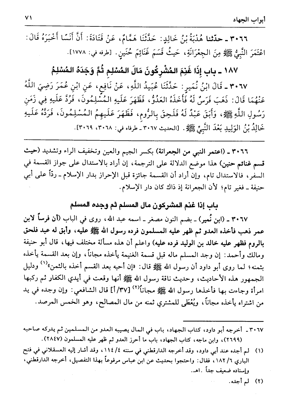 3067 - (ابن نُمير) -بضم النون مصغر- اسمه عبد الله، روى في الباب (أن فرسًا لابن عمر ذهب فأخذه العدو ثم ظهر عليه المسلمون فرده رسول الله - صلى الله عليه وسلم - عليه، وأبق له عبد فلحق بالروم فظهر عليه خالد بن الوليد فرده عليه) واعلم أن هذه مسألة مختلف فيها، قال أبو حنيفة ومالك وأحمد: إن وجد المسلم ماله قبل قسمة الغنيمة يأخذه مجانًا، كان بعد القسمة يأخذه بثمنه؛ لما روى أبو داود أن رسول الله - صلى الله عليه وسلم - قال: "إن أحبه بعد القسم أخذه بالثمن" ودليل الجمهور هذه الأحاديث، وحديث ناقة رسول الله - صلى الله عليه وسلم - أنها وقعت في أيدي الكفار ثم ركبها امرأة وجاءت بها فأخذها رسول الله - صلى الله عليه وسلم - مجانًا قال الشافعي: وإن وجده في يد من اشتراه ياخذه مجانًا، ويُعْطَى للمشتري ثمنه من مال المصالح، وهو الخمس المرصد.
