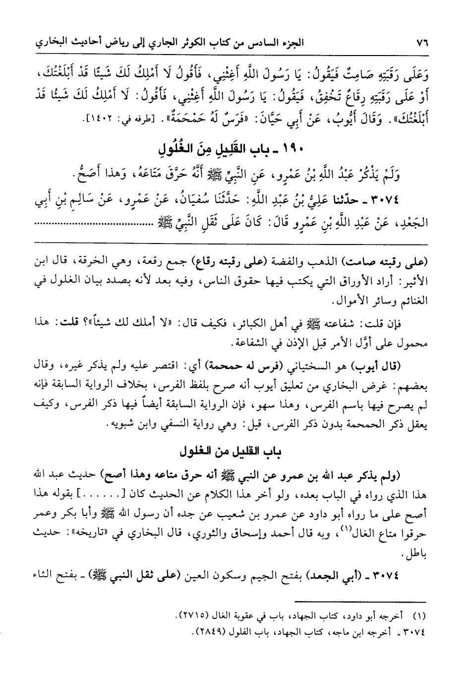 3074 - (أبي الجعد) بفتح الجيم وسكون العين (على ثقل النبي - صلى الله عليه وسلم -) -بفتح الثاء