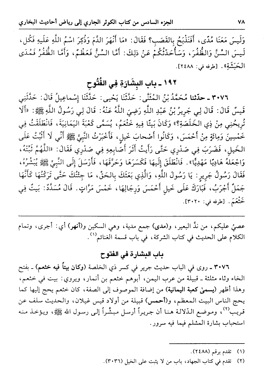 3076 - روى في الباب حديث جرير في كسر ذي الخلصة (وكان بيتًا فيه خثعم) -بفتح الخاء وثاء مثلثة- قبيلة من عرب اليمن، أبوهم خثعم بن أنمار، ويروي: بيت في خثعم، وهذا أظهر (يسمى كعبة اليمانية) من إضافة الموصوف إلى الصفة، كان خثعم يحج إليها كما يحج الناس البيت المعظم، و (أحمس) قبيلة من أولاد قيس غيلان، والحديث سلف عن قريب، وموضع الدّلالة هنا أن جريرًا أرسل مبشِّرًا إلى رسول الله - صلى الله عليه وسلم -، ويؤخذ منه استحباب بشارة المسلم فيما فيه سرور.