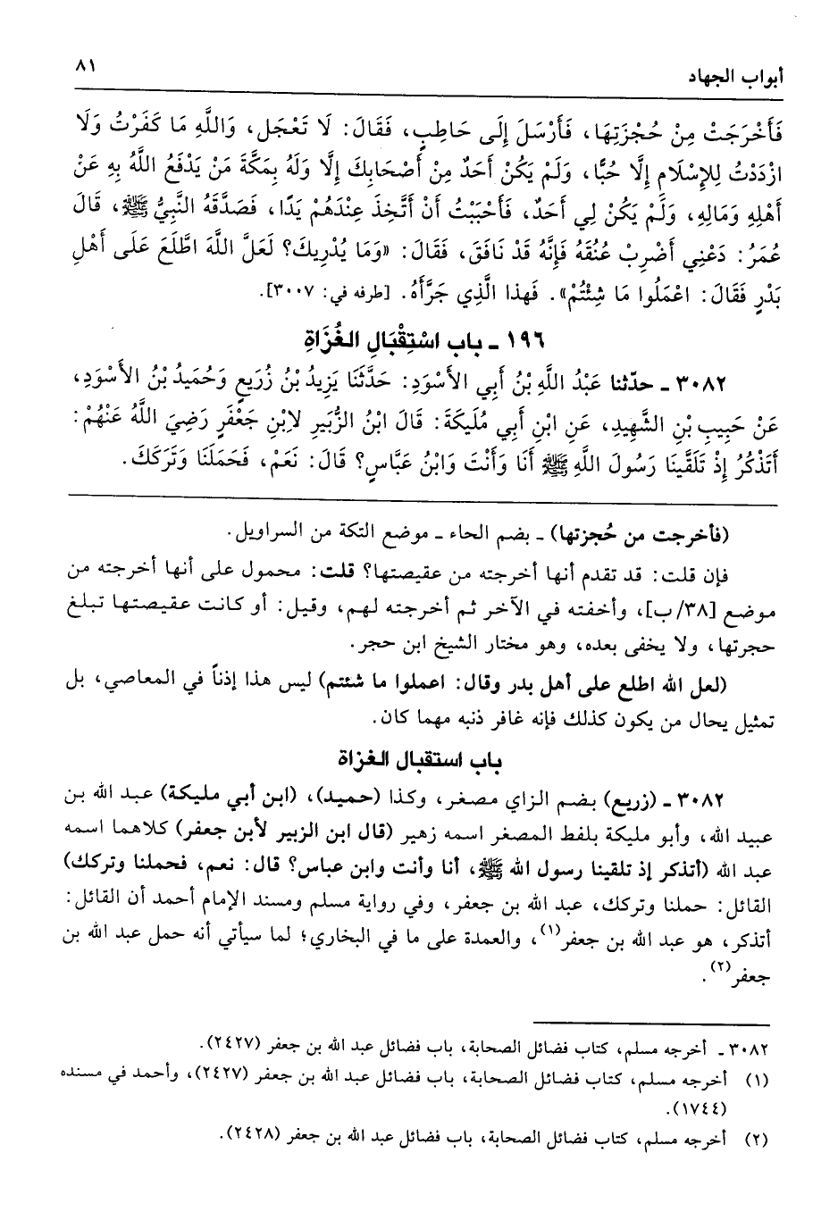 3082 - (زريع) بضم الزاي مصغر، وكذا (حميد)، (ابن أبي مليكة) عبد الله بن عبيد الله، وأبو مليكة بلفط المصغر اسمه زهير (قال ابن الزبير لأبن جعفر) كلاهما اسمه عبد الله (أتذكر إذ تلقينا رسول الله - صلى الله عليه وسلم -، أنا وأنت وابن عباس؟ قال: نعم، فحملنا وتركك) القائل: حملنا وتركك، عبد الله بن جعفر، وفي رواية مسلم ومسند الإمام أحمد أن القائل: أتذكر، هو عبد الله بن جعفر، والعمدة على ما في البخاري؛ لما سيأتي أنه حمل عبد الله بن جعفر.