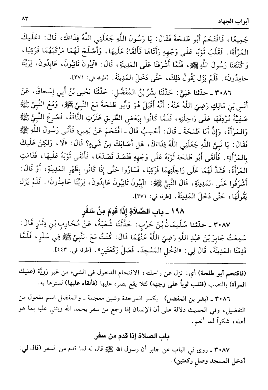 3086 - حَدَّثَنَا عَلِىٌّ حَدَّثَنَا بِشْرُ بْنُ الْمُفَضَّلِ حَدَّثَنَا يَحْيَى بْنُ أَبِى إِسْحَاقَ عَنْ أَنَسِ بْنِ مَالِكٍ - رضى الله عنه أَنَّهُ أَقْبَلَ هُوَ وَأَبُو طَلْحَةَ مَعَ النَّبِيِّ - صلى الله عليه وسلم - وَمَعَ النَّبِيِّ - صلى الله عليه وسلم - صَفِيَّةُ مُرْدِفَهَا عَلَى رَاحِلَتِهِ، فَلَمَّا كَانُوا بِبَعْضِ الطَّرِيقِ عَثَرَتِ النَّاقَةُ، فَصُرِعَ النَّبِىُّ - صلى الله عليه وسلم - وَالْمَرْأَةُ، وَإِنَّ أَبَا طَلْحَةَ - قَالَ أَحْسِبُ قَالَ - اقْتَحَمَ عَنْ بَعِيرِهِ فَأَتَى رَسُولَ اللَّهِ - صلى الله عليه وسلم - فَقَالَ يَا نَبِىَّ اللَّهِ جَعَلَنِى اللَّهُ فِدَاءَكَ، هَلْ أَصَابَكَ مِنْ شَىْءٍ قَالَ «لاَ، وَلَكِنْ عَلَيْكَ بِالْمَرْأَةِ». فَأَلْقَى أَبُو طَلْحَةَ ثَوْبَهُ عَلَى وَجْهِهِ، فَقَصَدَ قَصْدَهَا فَأَلْقَى ثَوْبَهُ عَلَيْهَا، فَقَامَتِ الْمَرْأَةُ، فَشَدَّ لَهُمَا عَلَى رَاحِلَتِهِمَا فَرَكِبَا، فَسَارُوا حَتَّى إِذَا كَانُوا بِظَهْرِ الْمَدِينَةِ - أَوْ قَالَ أَشْرَفُوا عَلَى الْمَدِينَةِ - قَالَ النَّبِىُّ - صلى الله عليه وسلم - «آيِبُونَ تَائِبُونَ عَابِدُونَ لِرَبِّنَا حَامِدُونَ». فَلَمْ يَزَلْ يَقُولُهَا حَتَّى دَخَلَ الْمَدِينَةَ. طرفه 371