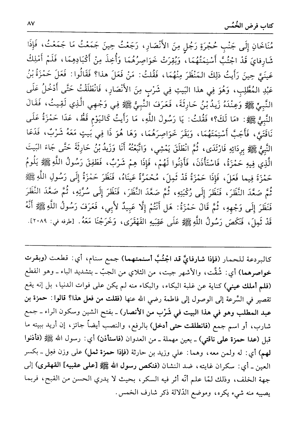 كالبردعة للحمار (فإذا شارفايَّ قد اجتُبَّ أسنمتهما) جمع سنام، أي: قطعت (وبقرت خواصرهما) أي: شُقَّت، والأشهر جبت، من الثلاي من الجبّ -بتشديد الباء- وهو القطع (فلم أملك عيني) كناية عن غلبة البكاء، والبكاء منه لم يكن على فوات الدنيا، بل إنه يقع تقصير في السرعة إلى الوصول إلى فاطمة رضي الله عنها (فقلت من فعل هذا؟ قالوا: حمزة ين عبد المطلب وهو في هذا البيت في شَرْب من الأنصار) -بفتح الشين وسكون الراء- جمع شارب، أو اسم جمع (فانطلقت حتى أدخل) بالرفع، والنصب أيضًا جائز، إن أريد ببيته ما قبل (عدا حمزة على ناقتي) -بعين مهملة- من العدوان (فاستأذن) أي: رسول الله - صلى الله عليه وسلم - (فأذنوا لهم) أي: له ولمن معه، وهما: علي وزيد بن حارثة (فإذا حمزة ثمل) على وزن فعِل -بكسر العين- أي: سكران غايته، ضد النشان (فنكص رسول الله - صلى الله عليه وسلم -[على عقبيه] القهقرى) إلى جهة الخلف، وذلك لمّا علم أنه أثر فيه السكر، بحيث لا يدري الحسن من القبح، فربما يصيبه منه شيء يكره، وموضع الدلالة ذكر شارف الخمس.