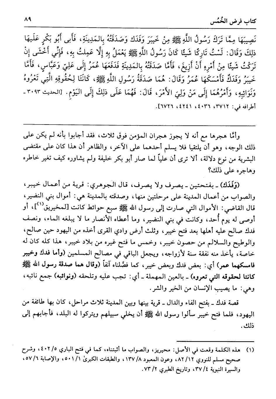 نَصِيبَهَا مِمَّا تَرَكَ رَسُولُ اللَّهِ - صلى الله عليه وسلم - مِنْ خَيْبَرَ وَفَدَكٍ وَصَدَقَتِهِ بِالْمَدِينَةِ، فَأَبَى أَبُو بَكْرٍ عَلَيْهَا ذَلِكَ، وَقَالَ لَسْتُ تَارِكًا شَيْئًا كَانَ رَسُولُ اللَّهِ - صلى الله عليه وسلم - يَعْمَلُ بِهِ إِلاَّ عَمِلْتُ بِهِ، فَإِنِّى أَخْشَى إِنْ تَرَكْتُ شَيْئًا مِنْ أَمْرِهِ أَنْ أَزِيغَ. فَأَمَّا صَدَقَتُهُ بِالْمَدِينَةِ فَدَفَعَهَا عُمَرُ إِلَى عَلِىٍّ وَعَبَّاسٍ، فَأَمَّا خَيْبَرُ وَفَدَكٌ فَأَمْسَكَهَا عُمَرُ وَقَالَ هُمَا صَدَقَةُ رَسُولِ اللَّهِ - صلى الله عليه وسلم - كَانَتَا لِحُقُوقِهِ الَّتِى تَعْرُوهُ وَنَوَائِبِهِ، وَأَمْرُهُمَا إِلَى مَنْ وَلِىَ الأَمْرَ. قَالَ فَهُمَا عَلَى ذَلِكَ إِلَى الْيَوْمِ. أطرافه 3712، 4036، 4241، 6726
