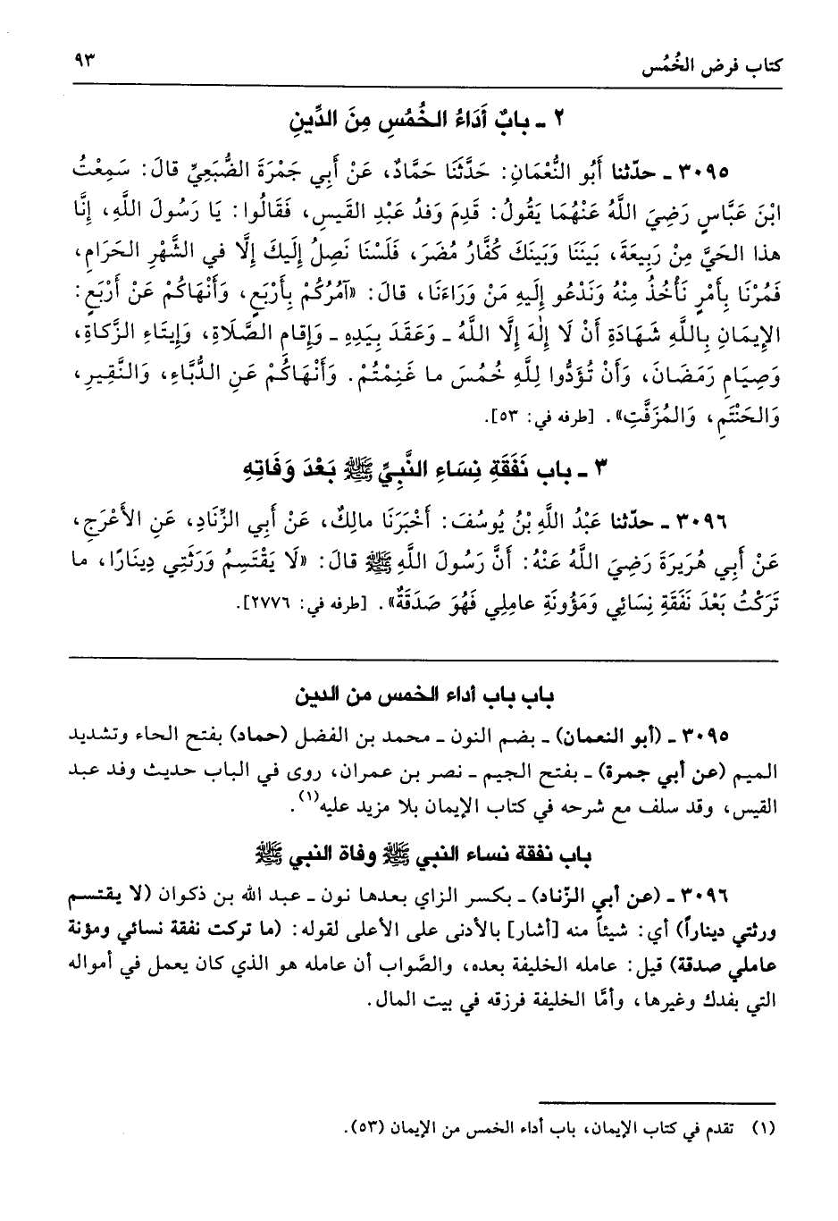 3095 - (أبو النعمان) -بضم النون- محمد بن الفضل (حماد) بفتح الحاء وتشديد الميم (عن أبي جمرة) -بفتح الجيم- نصر بن عمران، روى في الباب حديث وفد عبد القيس، وقد سلف مع شرحه في كتاب الإيمان بلا مزيد عليه.