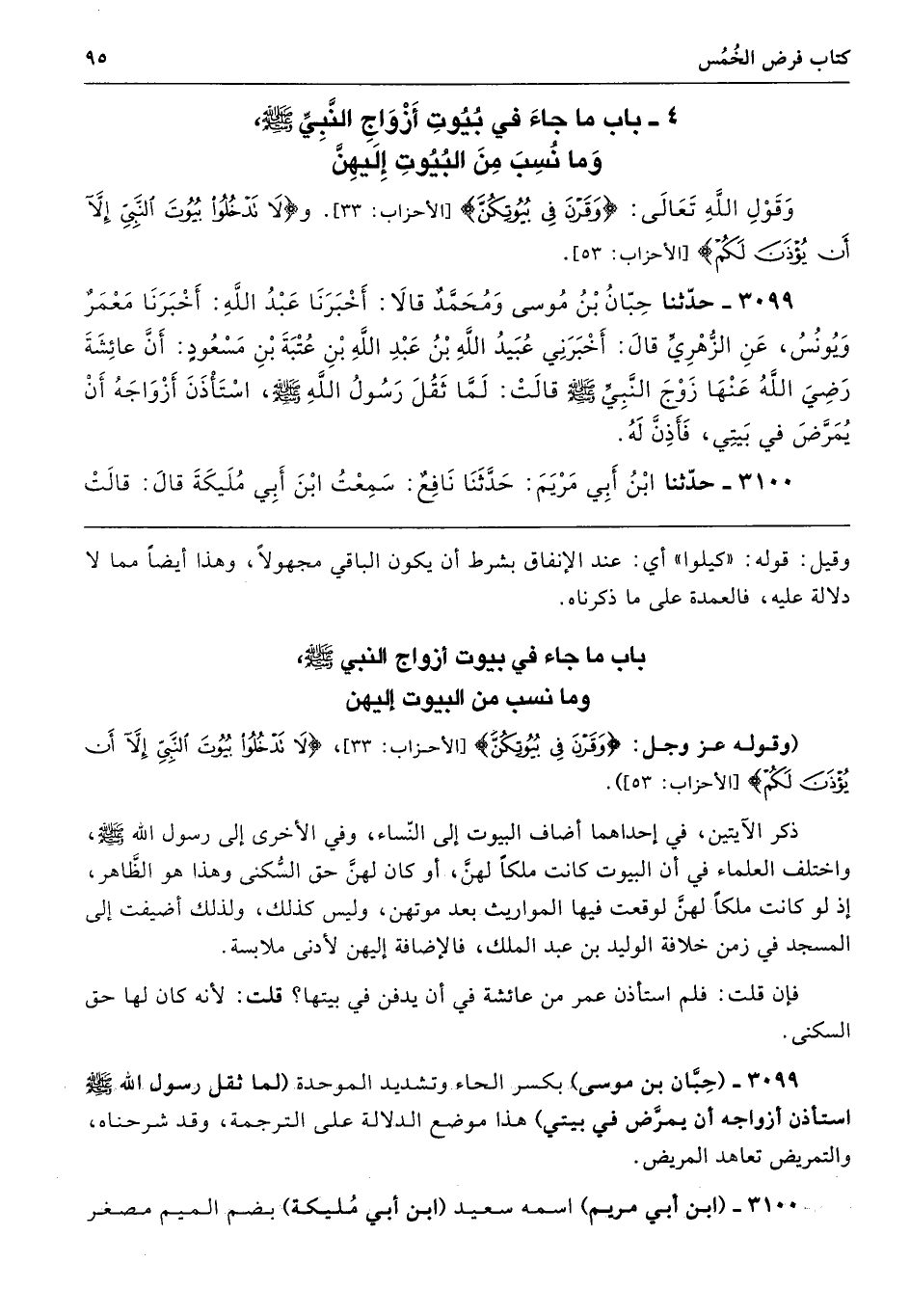 وَقَوْلِ اللَّهِ تَعَالَى (وَقَرْنَ فِي بُيُوتِكُنَّ) وَ (لاَ تَدْخُلُوا بُيُوتَ النَّبِيِّ إِلاَّ أَنْ يُؤْذَنَ لَكُمْ).