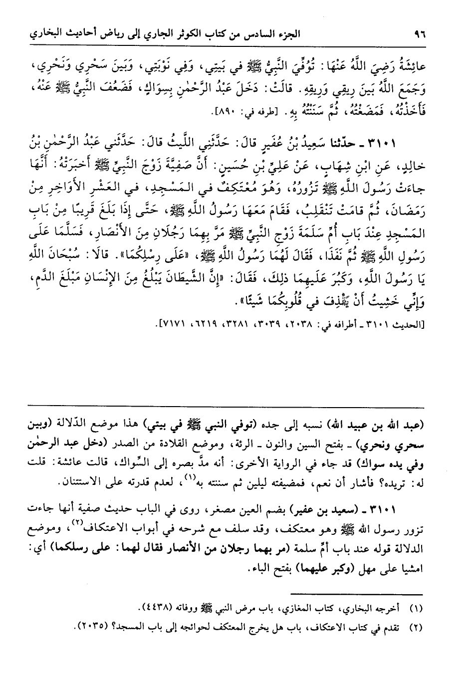 3101 - (سعيد بن عفير) بضم العين مصغر، روى في الباب حديث صفية أنها جاءت تزور رسول الله - صلى الله عليه وسلم - وهو معتكف، وقد سلف مع شرحه في أبواب الاعتكاف، وموضع الدلالة قوله عند باب أمِّ سلمة (مر بهما رجلان من الأنصار فقال لهما: على رسلكما) أي: امشيا على مهل (وكبر عليهما) بفتح الباء.