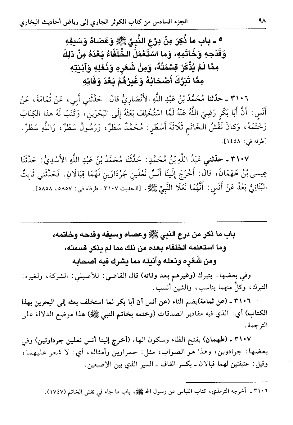 باب مَا ذُكِرَ مِنْ دِرْعِ النَّبِيِّ - صلى الله عليه وسلم - وَعَصَاهُ وَسَيْفِهِ وَقَدَحِهِ وَخَاتَمِهِ وَمَا اسْتَعْمَلَ الْخُلَفَاءُ بَعْدَهُ مِنْ ذَلِكَ مِمَّا لَمْ يُذْكَرْ قِسْمَتُهُ، وَمِنْ شَعَرِهِ وَنَعْلِهِ وَآنِيَتِهِ، مِمَّا يَتَبَرَّكُ أَصْحَابُهُ وَغَيْرُهُمْ بَعْدَ وَفَاتِهِ