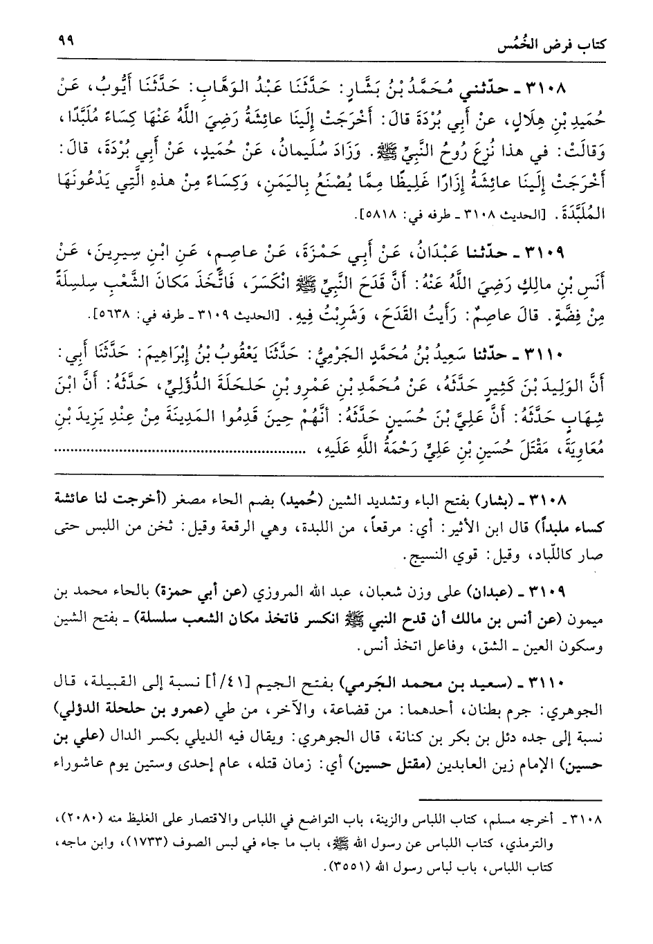 3110 - (سعيد بن محمد الجَرمي) بفتح الجيم نسبة إلى القبيلة، قال الجوهري: جرم بطنان، أحدهما: من قضاعة، والآخر، من طي (عمرو بن حلحلة الدؤلي) نسبة إلى جده دئل بن بكر بن كنانة، قال الجوهري: ويقال فيه الديلي بكسر الدال (علي بن حسين) الإمام زين العابدين (مقتل حسين) أي: زمان قتله، عام إحدى وستين يوم عاشوراء