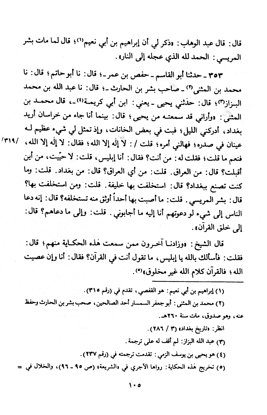 353 - حَدَّثَنَا أَبُو الْقَاسِمِ حَفْصُ بْنُ عُمَرَ قَالَ: نا أَبُو حَاتِمٍ، قَالَ: نا مُحَمَّدُ بْنُ الْمُثَنَّى، صَاحِبُ بِشْرِ بْنِ الْحَارِثِ، قَالَ: نا عَبْدُ اللَّهِ بْنُ مُحَمَّدٍ الْبَزَّازُ، قَالَ: حَدَّثَنِي يَحْيَى يَعْنِي ابْنَ أَبِي كَرِيمَةَ، قَالَ مُحَمَّدُ بْنُ الْمُثَنَّى: وَأُرَانِي قَدْ سَمِعْتُهُ مِنْ يَحْيَى قَالَ: " بَيْنَمَا أَنَا جَاءٍ مِنْ خُرَاسَانَ أُرِيدُ بَغْدَادَ أَدْرَكَنِي اللَّيْلُ، فَبِتُّ فِي بَعْضِ الْخَانَاتِ، وَإِذْ تَمَثَّلَ لِي شَيْءٌ عَظِيمٌ لَهُ عَيْنَانِ فِي صَدْرِهِ، فَهَالَنِي أَمْرُهُ، قُلْتُ: لَا إِلَهَ إِلَّا اللَّهُ، فَقَالَ: لَا إِلَهَ إِلَّا اللَّهُ، فَنِعْمَ مَا قُلْتَ، فَقُلْتُ لَهُ: مَنْ أَنْتَ؟ §فَقَالَ: أَنَا إِبْلِيسُ، قُلْتُ: لَا حَيِيتَ، مِنْ أَيْنَ أَقْبَلَتَ؟ قَالَ: مِنَ الْعِرَاقِ، قُلْتُ: مِنْ أَيِّ الْعِرَاقِ؟ قَالَ: مِنْ بَغْدَادَ. قُلْتُ: وَمَا كُنْتَ تَصْنَعُ بِبَغْدَادَ؟ قَالَ: اسْتَخْلَفْتُ بِهَا خَلِيفَةً. قُلْتُ: وَمَنِ اسْتَخْلَفْتَ بِهَا؟ قَالَ: بِشْرٌ الْمِرِّيسِيُّ. قُلْتُ: مَا أَصَبْتَ بِهَا أَحَدًا أَوْثَقَ مِنْهُ تَسْتَخْلِفُهُ؟ قَالَ: إِنَّهُ دَعَا النَّاسَ إِلَى شَيْءٍ لَوْ دَعْوَتُهُمْ أَنَا إِلَيْهُ مَا أَجَابُونِي. قُلْتُ: وَإِلَى مَا دَعَاهُمْ؟ قَالَ: إِلَى خَلْقِ الْقُرْآنِ " قَالَ الشَّيْخُ: وَزَادَنَا آخَرُونَ مِمَّنْ سَمِعْتُ هَذِهِ الْحِكَايَةَ مِنْهُمْ قَالَ: فَقُلْتُ: فَأَسْأَلُكَ بِاللَّهِ يَا إِبْلِيسُ، مَا تَقُولُ أَنْتَ فِي الْقُرْآنِ؟ فَقَالَ: أَنَا وَإِنْ عَصَيْتُ اللَّهَ، فَالْقُرْآنُ كَلَامُ اللَّهِ غَيْرُ مَخْلُوقٍ