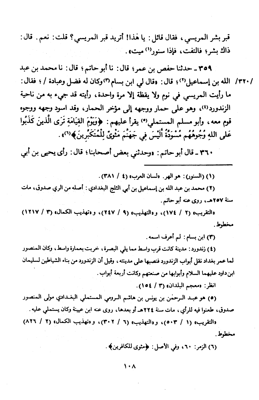 359 - حَدَّثَنَا حَفْصُ بْنُ عُمَرَ، قَالَ: نا أَبُو حَاتِمٍ، قَالَ: نا مُحَمَّدُ بْنُ عَبْدِ اللَّهِ بْنِ إِسْمَاعِيلَ، قَالَ: قَالَ لِيَ ابْنُ بَسَّامٍ وَكَانَ لَهُ فَضْلٌ وَعِبَادَةٌ، فَقَالَ: §" مَا رَأَيْتُ الْمِرِّيسِيَّ فِي نَوْمٍ وَلَا يَقَظَةٍ إِلَّا مَرَّةً وَاحِدَةَ، رَأَيْتُهُ قَدْ جِيءَ بِهِ مِنْ نَاحِيَةِ الزَّنْدَوَرْدِ، وَهُوَ عَلَى حِمَارٍ وَوَجْهُهُ إِلَى مُؤَخَّرِ الْحِمَارِ، وَقَدِ اسْوَدَّ وَجْهُهُ وَوُجُوهُ قَوْمٍ مَعَهُ، وَأَبُو مُسْلِمٍ الْمُسْتَمْلِيُّ يَقْرَأُ عَلَيْهِمْ {وَيَوْمَ الْقِيَامَةِ تَرَى الَّذِينَ كَذَبُوا عَلَى اللَّهِ وُجُوهُهُمْ مُسْوَدَّةٌ أَلَيْسَ فِي جَهَنَّمَ مَثْوًى لِلْمُتَكَبِّرِينَ} [الزمر: 60] "