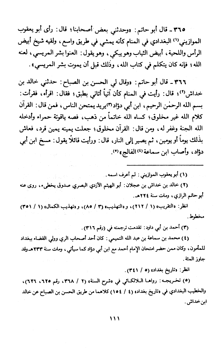 366 - قَالَ أَبُو حَاتِمٍ: وَقَالَ لِيَ الْحَسَنُ بْنُ الصَّبَّاحِ: حَدَّثَنِي خَالِدُ بْنُ خِدَاشٍ، قَالَ: " رَأَيْتُ فِيَ الْمَنَامِ كَأَنَّ آتِيًا أَتَانِي بِطَبَقٍ، فَقَالَ: اقْرَأْهُ، فَقَرَأْتُ: بِسْمِ اللَّهِ الرَّحْمَنِ الرَّحِيمِ، ابْنُ أَبِي دُؤَادٍ يُرِيدُ يَمْتَحِنُ النَّاسَ، فَمَنْ قَالَ: الْقُرْآنُ كَلَامُ اللَّهِ غَيْرُ مَخْلُوقٍ، كَسَاهُ اللَّهُ خَاتَمًا مِنْ ذَهَبٍ فَصُّهُ يَاقُوتَةٌ حَمْرَاءُ وَأَدْخَلَهُ اللَّهُ الْجَنَّةَ وَغَفَرَ لَهُ، §وَمَنْ قَالَ: الْقُرْآنُ مَخْلُوقٌ جُعِلَتْ يَمِينُهُ يَمِينَ قِرْدٍ، فَعَاشَ بِذَلِكَ يَوْمًا أَوْ يَوْمَيْنٍ، ثُمَّ يَصِيرُ إِلَى النَّارِ، قَالَ: وَرَأَيْتُ قَائِلًا يَقُولُ: مُسِخَ ابْنُ أَبِي دُؤَادٍ، وَأَصَابَ ابْنَ سَمَاعَةَ الْفَالِجُ "