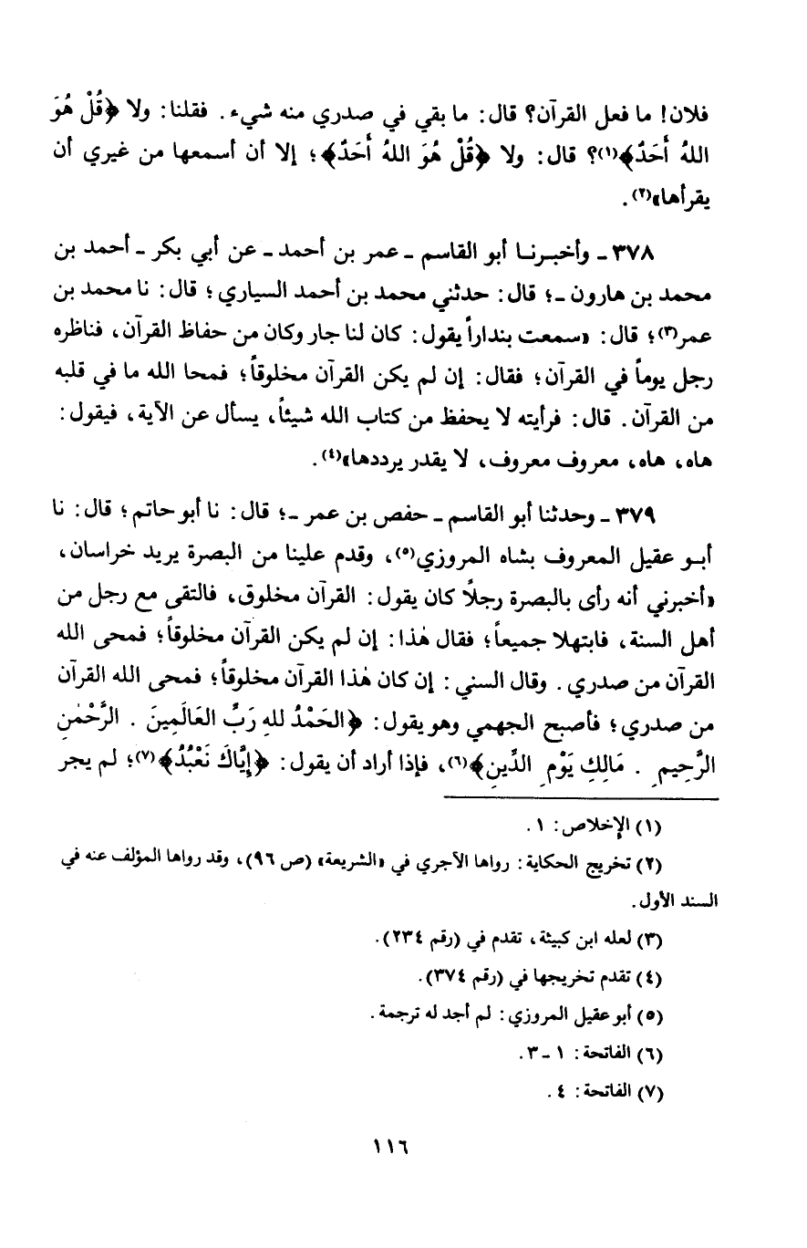 378 - وَأَخْبَرَنَا أَبُو الْقَاسِمِ عُمَرُ بْنُ أَحْمَدَ، عَنْ أَبِي بَكْرٍ أَحْمَدَ بْنِ مُحَمَّدِ بْنِ هَارُونَ، قَالَ: حَدَّثَنِي مُحَمَّدُ بْنُ أَحْمَدَ السَّيَّارِيُّ، قَالَ: نا مُحَمَّدُ بْنُ عُمَرَ، قَالَ: سَمِعْتُ بُنْدَارًا، يَقُولُ: §" كَانَ لَنَا جَارٌ وَكَانَ مِنْ حُفَّاظِ الْقُرْآنِ فَنَاظَرَهُ رَجُلٌ يَوْمًا فِي الْقُرْآنِ، فَقَالَ: إِنْ لَمْ يَكُنِ الْقُرْآنُ مَخْلُوقًا فَمَحَا اللَّهُ مَا فِي قَلْبِهِ مِنَ الْقُرْآنِ. قَالَ: فَرَأَيْتُهُ لَا يَحْفَظُ مِنْ كِتَابِ اللَّهِ شَيْئًا، يُسْأَلُ عَنِ الْآيَةِ، فَيَقُولُ: هَاهْ، هَاهْ، مَعْرُوفٌ مَعْرُوفٌ، لَا يَقْدِرُ يُرَدِّدُهَا "