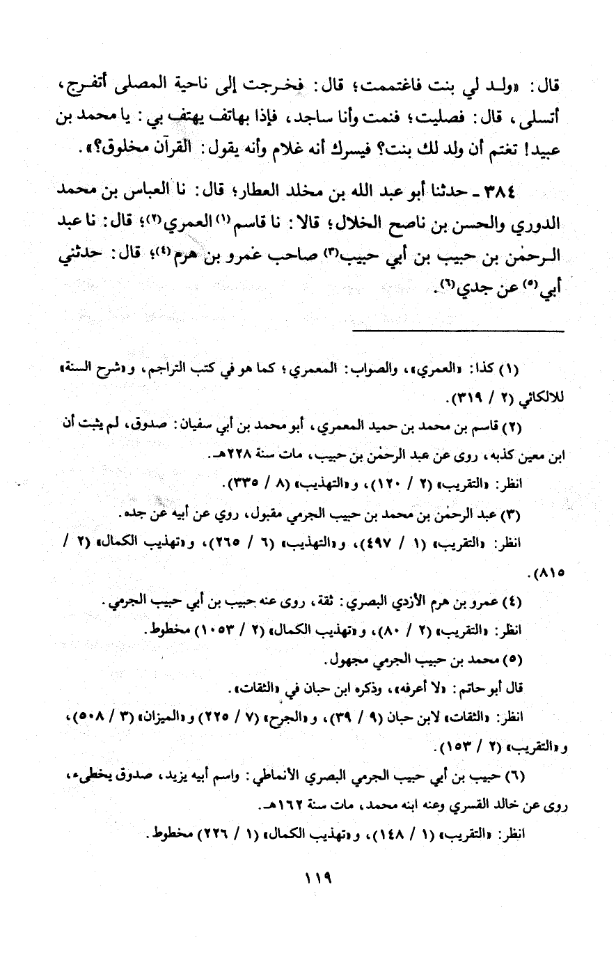 386 - وَحَدَّثَنِي أَبُو الْقَاسِمِ حَفْصُ بْنُ عُمَرَ قَالَ: نا أَبُو حَاتِمٍ الرَّازِيُّ، قَالَ: نا أَبُو بَكْرِ بْنُ أَبِي عَتَّابٍ الْأَعْيُنُ، قَالَ: نا الْقَاسِمُ بْنُ مُحَمَّدِ بْنِ حُمَيْدٍ الْعُمَرِيُّ، قَالَ: نا عَبْدُ الرَّحْمَنِ بْنُ حَبِيبِ بْنِ أَبِي حَبِيبٍ، صَاحِبُ خَالِدِ بْنِ يَزِيدَ، عَنْ أَبِيهِ، عَنْ جَدِّهِ، قَالَ: شَهِدْتُ خَالِدَ بْنَ عَبْدِ اللَّهِ الْقَسْرِيَّ خَطَبَ النَّاسَ يَوْمَ النَّحْرِ، فَقَالَ: «أَيُّهَا النَّاسُ ضَحُّوا تَقَبَّلَ اللَّهُ مِنْكُمْ، §فَإِنِّي مُضَحٍّ بِالْجَعْدِ بْنِ دِرْهَمٍ، فَإِنَّهُ زَعَمَ أَنَّ اللَّهَ لَمْ يُكَلِّمْ مُوسَى تَكْلِيمًا، وَلَمْ يَتَّخِذْ إِبْرَاهِيمَ خَلِيلًا، سُبْحَانَهُ وَتَعَالَى عَمَّا يَقُولُ الْجَعْدُ بْنُ دِرْهَمٍ عُلُوًّا كَبِيرًا، ثُمَّ نَزَلَ إِلَيْهِ فَذَبَحَهُ» -[121]-
