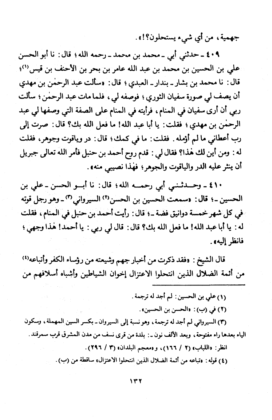410 - وَحَدَّثَنِي أَبِي رَحِمَهُ اللَّهُ، قَالَ: نا أَبُو الْحَسَنِ عَلِيُّ بْنُ الْحُسَيْنِ، قَالَ: سَمِعْتُ الْحُسَيْنَ بْنَ الْحَسَنِ السِّيرَوَانِيُّ، وَهُوَ رَجُلٌ قُوتُهُ فِي كُلِّ شَهْرٍ خَمْسَةُ دَوَانِيقَ فِضَّةٍ، قَالَ: " §رَأَيْتُ أَحْمَدَ بْنَ حَنْبَلٍ فِي الْمَنَامِ، فَقُلْتُ لَهُ: يَا أَبَا عَبْدِ اللَّهِ مَا فَعَلَ اللَّهُ بِكَ؟ قَالَ: قَالَ لِي رَبِّي: يَا أَحْمَدُ هَذَا وَجْهِي، فَانْظُرْ إِلَيْهِ " قَالَ الشَّيْخُ: فَقَدْ ذَكَرْتُ مِنْ أَخْبَارِ جَهْمٍ وَشِيعَتِهِ مِنْ رُؤَسَاءِ الْكُفْرِ وَأَتْبَاعِهِ مِنْ أَئِمَّةِ الضَّلَالِ الَّذِينَ انْتَحَلُوا الِاعْتِزَالَ، إِخْوَانَ الشَّيَاطِينِ وَأَشْبَاهَ أَسْلَافِهِمْ مِنْ -[133]- عَبْدَةِ الْأَوْثَانِ مِنَ الْمُشْرِكِينَ، مَا فِيهِ مُعْتَبَرٌ لِلْعَاقِلِينَ وَمُزْدَجَرٌ لِلْمُفْتَرِينَ، وَذَلِكَ عَلَى اخْتِصَارٍ مِنَ الْإِكْثَارِ وَاقْتِصَارٍ عَلَى مُبَلِّغٍ وَسِعَ السَّامِعِينَ، فَإِنَّ الَّذِي انْتَهَى إِلَيْنَا مِنْ قُبْحِ أَخْبَارِهِمْ وَسُوءِ مَذَاهِبِهِمْ يَكْثُرُ عَلَى الْإِحْصَاءِ، وَيَطُولُ شَرْحُهُ لِلْاسْتِقْصَاءِ، وَطَوَيْتُ مِنْ أَقْوَالِهِمْ مَا تَقْشَعِرُّ مِنْهُ الْجُلُودُ، وَلَا تَثْبُتُ لِسَمَاعِهِ الْقُلُوبُ، وَقَدْ قَدَّمْتُ الْقَوْلَ فِيمَا رُوِيَ عَنْ عَبْدِ اللَّهِ بْنِ الْمُبَارَكِ رَحِمَهُ اللَّهُ قَالَ: إِنَّا لَنَحْكِي كَلَامَ الْيَهُودِ وَالنَّصَارَى، وَمَا نَسْتَطِيعُ أَنْ نَحْكِيَ كَلَامَ الْجَهْمِيَّةِ، وَصَدَقَ عَبْدُ اللَّهِ فَإِنَّ الَّذِي تُجَادِلُ عَلَيْهِ هَذِهِ الطَّائِفَةُ الضُّلَّالُ، وَتَتَفَوَّهُ بِهِ مِنْ قَبِيحِ الْمَقَالِ فِي اللَّهِ عَزَّ وَجَلَّ تَتَحَوَّبُ الْيَهُودُ وَالنَّصَارَى وَالْمَجُوسُ عَنِ التَّفَوِّهِ بِهِ