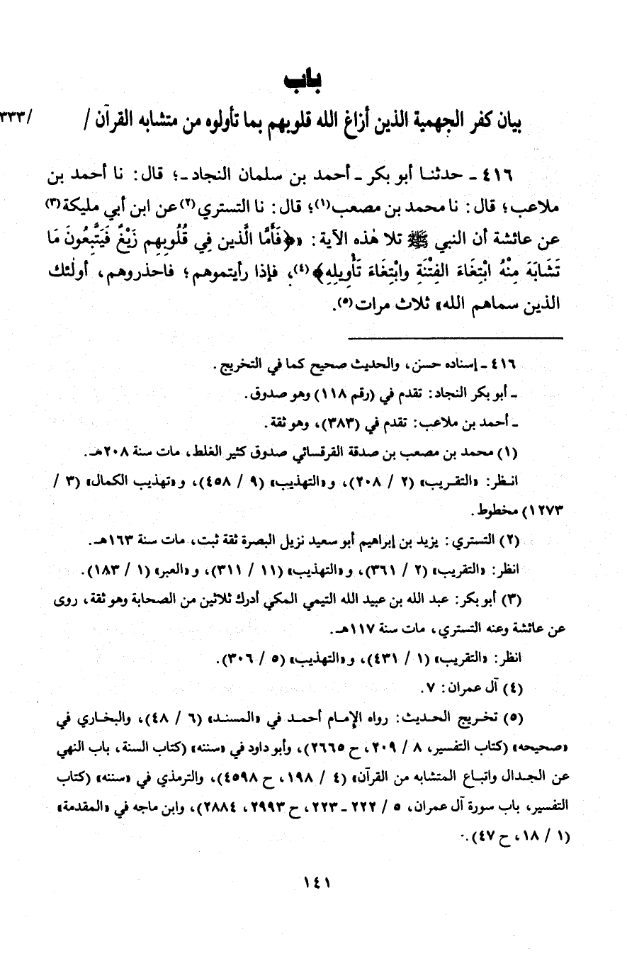 416 - حَدَّثَنَا أَبُو بَكْرٍ أَحْمَدُ بْنُ سَلْمَانَ النِّجَّادُ، قَالَ: نا أَحْمَدُ بْنُ مُلَاعِبٍ، قَالَ: نا مُحَمَّدُ بْنُ مُصْعَبٍ، قَالَ: نا التُّسْتَرِيُّ، عَنِ ابْنِ أَبِي مُلَيْكَةَ، عَنْ عَائِشَةَ، أَنَّ النَّبِيَّ صَلَّى اللَّهُ عَلَيْهِ وَسَلَّمَ " تَلَا هَذِهِ الْآيَةَ {فَأَمَّا الَّذِينَ فِي قُلُوبِهِمْ زَيْغٌ فَيَتَّبِعُونَ مَا تَشَابَهَ مِنْهُ ابْتِغَاءَ الْفِتْنَةِ وَابْتِغَاءَ تَأْوِيلِهِ} [آل عمران: 7]، §فَإِذَا رَأَيْتُمُوهُمْ، فَاحْذَرُوهُمْ، أُولَئِكَ الَّذِينَ سَمَّاهُمُ اللَّهُ ثَلَاثَ مَرَّاتٍ "