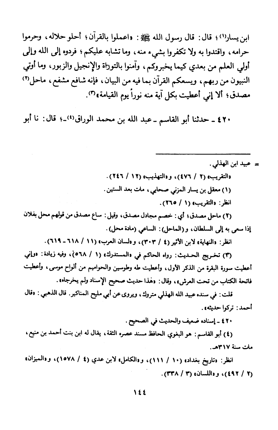 420 - حَدَّثَنَا أَبُو الْقَاسِمِ عَبْدُ اللَّهِ بْنُ مُحَمَّدٍ الْوَرَّاقُ، قَالَ: نا أَبُو -[145]- الرَّبِيعِ الزَّهْرَانِيُّ، قَالَ: نا الْحَارِثُ بْنُ عُبَيْدٍ، عَنْ أَبِي عِمْرَانَ الْجَوْنِيِّ، عَنْ جُنْدُبِ بْنِ عَبْدِ اللَّهِ الْبَجَلِيِّ، قَالَ: قَالَ رَسُولُ اللَّهِ صَلَّى اللَّهُ عَلَيْهِ وَسَلَّمَ: «§اقْرَأُوا الْقُرْآنَ مَا ائْتَلَفَتْ عَلَيْهِ قُلُوبُكُمْ، فَإِذَا اخْتَلَفْتُمْ، فَقُومُوا عَنْهُ»