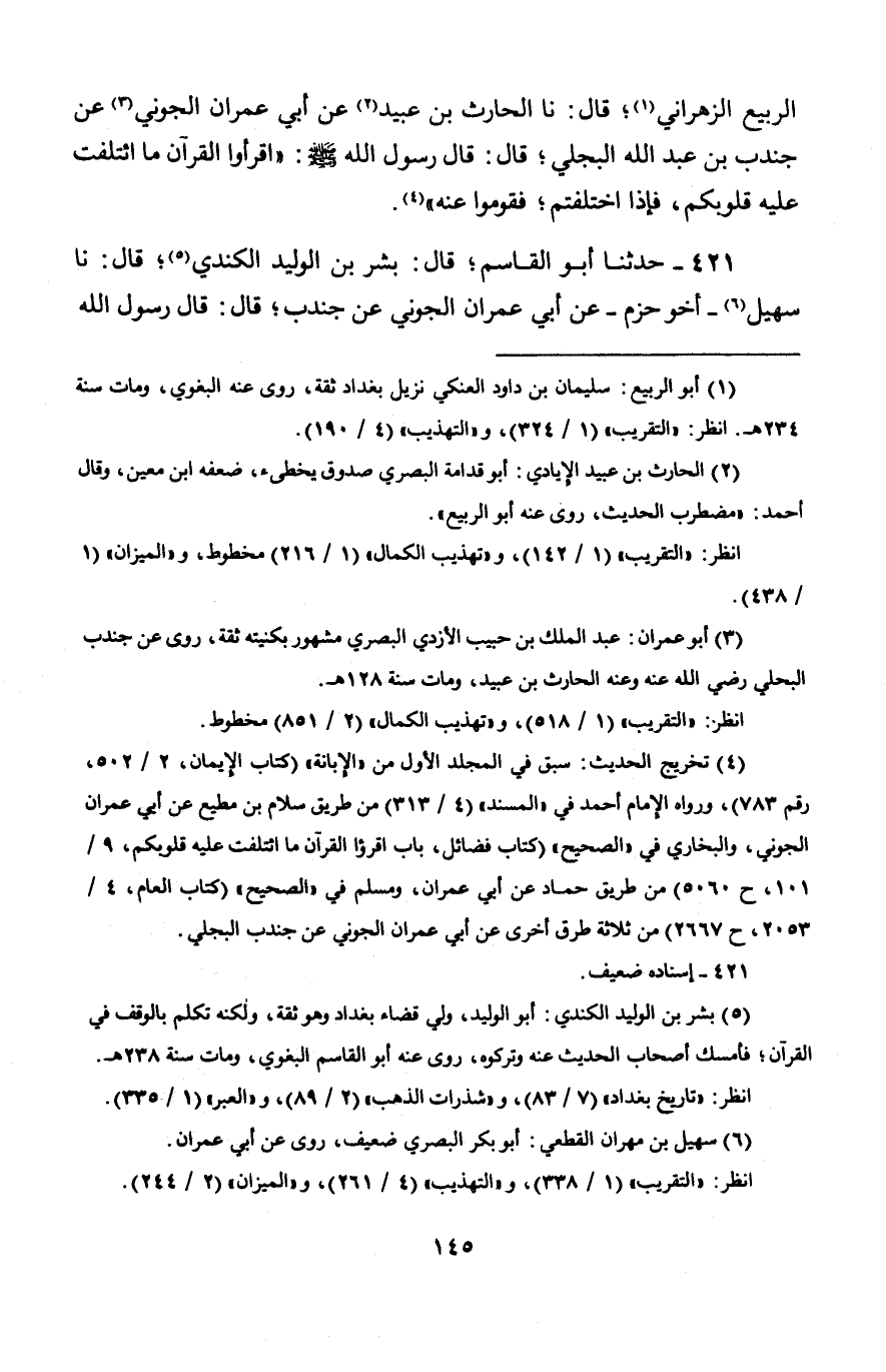421 - حَدَّثَنَا أَبُو الْقَاسِمِ، قَالَ: بِشْرُ بْنُ الْوَلِيدِ الْكِنْدِيُّ، قَالَ: نا سُهَيْلٌ، أَخُو حَزْمٍ، عَنْ أَبِي عِمْرَانَ الْجَوْنِيِّ، عَنْ جُنْدُبٍ، قَالَ: قَالَ رَسُولُ اللَّهِ -[146]- صَلَّى اللَّهُ عَلَيْهِ وَسَلَّمَ: «§مَنْ قَالَ فِي الْقُرْآنِ بِرَأْيِهِ فَأَصَابَ، فَقَدْ أَخْطَأَ»