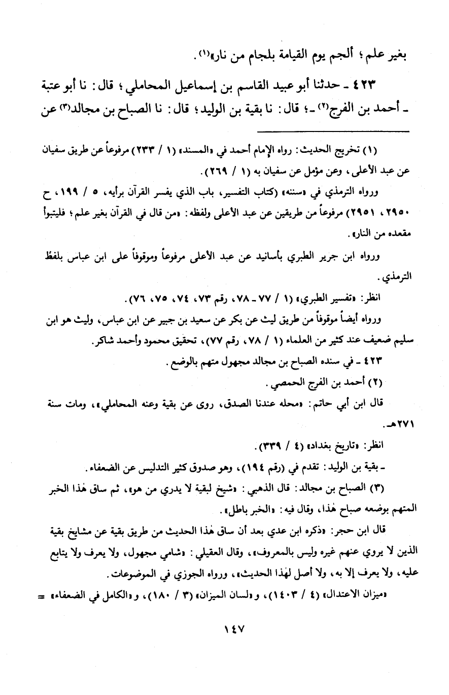 423 - حَدَّثَنَا أَبُو عُبَيْدٍ الْقَاسِمُ بْنُ إِسْمَاعِيلَ الْمَحَامِلِيُّ، قَالَ: نا أَبُو عُتْبَةَ أَحْمَدُ بْنُ الْفَرَجِ، قَالَ: نا بَقِيَّةُ بْنُ الْوَلِيدِ، قَالَ: نا الصَّبَّاحُ بْنُ مُجَالِدٍ، عَنْ -[148]- عَطِيَّةَ الْعَوْفِيِّ، عَنْ أَبِي سَعِيدٍ الْخُدْرِيِّ، قَالَ: قَالَ رَسُولُ اللَّهِ صَلَّى اللَّهُ عَلَيْهِ وَسَلَّمَ: «§إِذَا كَانَ سَنَةُ خَمْسٍ وَثَلَاثِينَ وَمِئَةٍ خَرَجَتْ مَرَدَةُ الشَّيَاطِينَ، كَانَ حَبَسَهُمْ سُلَيْمَانُ بْنُ دَاوُدَ عَلَيْهِ السَّلَامُ فِي جَزَائِرِ الْبُحُورِ، فَيَذْهَبُ تِسْعَةُ أَعْشَارِهِمْ إِلَى الْعِرَاقِ يُجَادِلُونَهُمْ بِمُشْتَبَهِ الْقُرْآنِ، وَعُشْرٌ بِالشَّامِ»