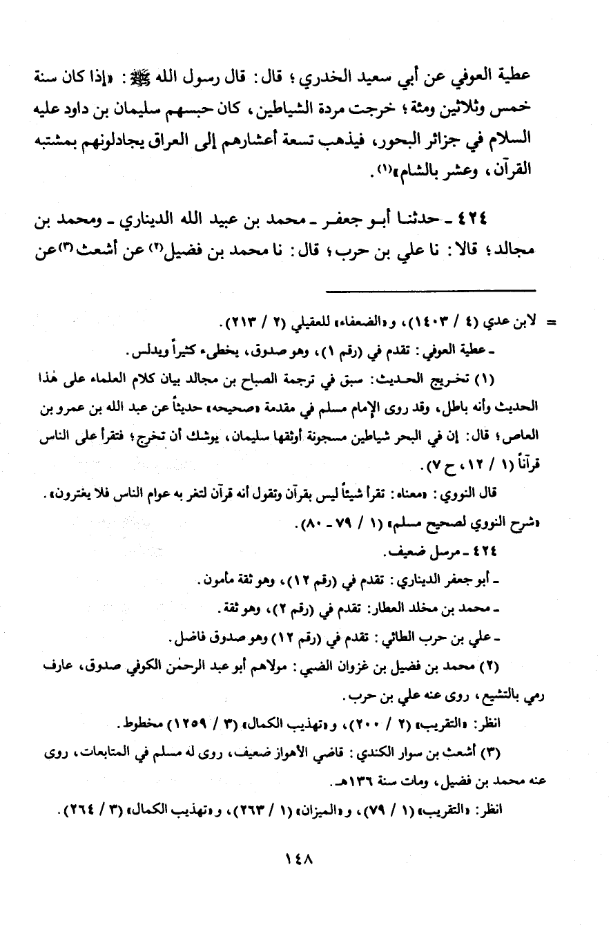 424 - حَدَّثَنَا أَبُو جَعْفَرٍ مُحَمَّدُ بْنُ عُبَيْدِ اللَّهِ الدِّينَارِيُّ، وَمُحَمَّدُ بْنُ مُجَالِدٍ، قَالَا: نا عَلِيُّ بْنُ حَرْبٍ، قَالَ: نا مُحَمَّدُ بْنُ فُضَيْلٍ، عَنْ أَشْعَثَ، عَنْ -[149]- أَبِي صَفْوَانَ، عَنِ ابْنِ مَسْعُودٍ، قَالَ: " إِنَّ اللَّهَ عَزَّ وَجَلَّ أَنْزَلَ هَذَا الْقُرْآنَ تِبْيَانًا لِكُلِّ شَيْءٍ، وَلَكِنْ §عِلْمُنَا يَقْصُرُ عَمَّا بَيَّنَ لَنَا فِي الْقُرْآنِ، ثُمَّ قَرَأَ {وَنَزَّلْنَا عَلَيْكَ الْكِتَابَ تِبْيَانًا لِكُلِّ شَيْءٍ} [النحل: 89] "