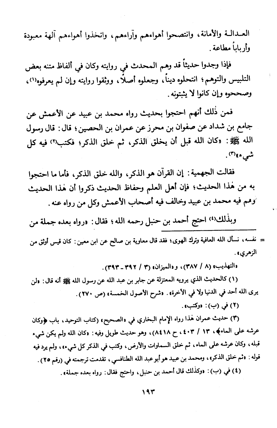 425 - رَوَاهُ مُحَمَّدُ بْنُ عُبَيْدٍ، عَنِ الْأَعْمَشِ، عَنْ جَامِعِ بْنِ شَدَّادٍ، عَنْ صَفْوَانَ بْنِ مُحْرِزٍ، عَنْ عِمْرَانَ بْنِ الْحُصَيْنِ قَالَ: قَالَ رَسُولُ اللَّهِ صَلَّى اللَّهُ عَلَيْهِ وَسَلَّمَ: § «كَانَ اللَّهُ قَبْلَ أَنْ يَخْلُقَ الذِّكْرَ، ثُمَّ خَلَقَ الذِّكْرَ، فَكَتَبَ فِيهِ كُلَّ شَيْءٍ» فَقَالَتِ الْجَهْمِيَّةُ: إِنَّ الْقُرْآنَ هُوَ الذِّكْرُ، وَاللَّهُ خَلَقَ الذِّكْرَ، فَأَمَّا مَا احْتَجُّوا بِهِ مِنْ هَذَا الْحَدِيثِ فَإِنَّ أَهْلَ الْعِلْمِ وَحُفَّاظَ الْحَدِيثِ ذَكَرُوا أَنَّ هَذَا الْحَدِيثَ وَهِمَ فِيهِ مُحَمَّدُ بْنُ عُبَيْدٍ وَخَالَفَ فِيهِ أَصْحَابَ الْأَعْمَشِ وَكُلَّ مَنْ رَوَاهُ عَنْهُ، وَبِذَلِكَ احْتَجَّ أَحْمَدُ بْنُ حَنْبَلٍ رَحِمَهُ اللَّهُ، فَقَالَ: رَوَاهُ بَعْدَهُ جُمْلَةٌ مِنَ -[194]- الثِّقَاتِ، فَلَمْ يَقُولُوا: خَلَقَ الذِّكْرَ، وَلَكِنْ قَالُوا: كَتَبَ فِي الذِّكْرِ، وَالذِّكْرُ هَاهُنَا غَيْرُ الْقُرْآنِ، وَلَكِنَّ قُلُوبَ الْجَهْمِيَّةِ فِي أَكِنَّةٍ، وَعَلَى أَبْصَارِهِمْ غِشَاوَةٌ، فَلَا يَعْرِفُونَ مِنَ الْكِتَابِ إِلَّا مَا تَشَابَهَ، وَلَا يَقْبَلُونَ مِنَ الْحَدِيثِ إِلَّا مَا ضَعُفَ وَأُشْكِلَ، وَالذَّكَرُ هَاهُنَا هُوَ اللَّوْحُ الْمَحْفُوظُ، الَّذِي فِيهِ ذِكْرُ كُلِّ شَيْءٍ، أَلَا تَرَى أَنَّ فِيَ لَفْظِ الْحَدِيثِ الَّذِي احْتَجُّوا بِهِ قَالَ: فَكَتَبَ فِيهِ كُلَّ شَيْءٍ أَفَتَرَاهُ كَتَبَ فِي كَلَامِهِ كُلَّ شَيْءٍ وَقَدْ بَيَّنَ اللَّهُ ذَلِكَ مِنْ كِتَابِهِ، وَذَلِكَ أَنَّ الذِّكْرَ فِي كِتَابِ اللَّهِ عَلَى لَفْظٍ وَاحِدٍ بِمَعَانٍ مُخْتَلِفَةٍ، فَقَالَ {ص وَالْقُرْآنِ ذِي الذِّكْرِ} [ص: 1]، يَعْنِي: ذَا الشَّرَفِ، وَقَالَ {لَقَدْ أَنْزَلْنَا إِلَيْكُمْ كِتَابًا فِيهِ ذِكْرُكُمْ} [الأنبياء: 10]، يَعْنِي: شَرَفَكُمْ. وَقَالَ: {بَلْ أَتَيْنَاهُمْ بِذِكْرِهِمْ} [المؤمنون: 71]، يَعْنِي: بِخَبَرِهِمْ. {وَإِنَّهُ لَذِكْرٌ لَكَ وَلِقَوْمِكَ} [الزخرف: 44]، يَقُولُ: وَإِنَّهُ لَشَرَفٌ لَكَ وَلِقَوْمِكَ. وَقَالَ {إِذَا نُودِيَ لِلصَّلَاةِ مِنْ يَوْمِ الْجُمُعَةِ فَاسْعَوْا إِلَى ذِكْرِ اللَّهِ} [الجمعة: 9] يَعْنِي: الصَّلَاةَ. وَقَالَ: {وَلَقَدْ كَتَبْنَا فِي الزَّبُورِ مِنْ بَعْدِ الذِّكْرِ} [الأنبياء: 105] يَعْنِي: فِي اللَّوْحِ -[195]- الْمَحْفُوظِ، لَا يَجُوزُ أَنْ يَكُونَ الذِّكْرُ هَاهُنَا الْقُرْآنُ، لِأَنَّهُ قَالَ {فِي الزَّبُورِ مِنْ بَعْدِ الذِّكْرِ} [الأنبياء: 105]، وَالزَّبُورُ قَبْلَ الْقُرْآنِ، وَالذِّكْرُ أَيْضًا هُوَ الْقُرْآنُ فِي غَيْرِ هَذِهِ الْآيَاتِ كَمَا أَعْلَمْتُكَ، إِلَّا أَنَّ الْحَرْفَ يَأْتِي بِلَفْظٍ وَاحِدٍ، وَمَعْنَاهُ شَتَّى وَالْجَهْمِيُّ يَقْصِدُ لَمَّا كَانَتْ هَذِهِ سَبِيلَهُ، فَيَتَأَوَّلُهُ عَلَى الْمَعْنَى الَّذِي يُوَافِقُ هَوَاهُ، وَلَا يَجْعَلُ لَهُ وَجْهًا غَيْرَهُ، وَاللَّهُ يُكَذِّبُهُ وَيَرُدُّ عَلَيْهِ هَوَاهُ. وَمِمَّا وَضَحَ بِهِ كُفْرُ الْجَهْمِيِّ مَا رَدَّهُ عَلَى اللَّهِ وَجَحَدَهُ مِنْ كِتَابِهِ، فَزَعَمَ أَنَّ اللَّهَ لَمْ يَقُلْ شَيْئًا قَطُّ وَلَا يَقُولُ شَيْئًا أَبَدًا، فَيُقَالُ لَهُ: فَأَخْبِرْنَا عَنْ كُلِّ شَيْءٍ فِي الْقُرْآنِ: قَالَ اللَّهُ وَقُلْنَا، وَيَوْمَ نَقُولُ، فَقَالَ: إِنَّمَا هَذَا كُلُّهُ كَمَا يَقُولُ النَّاسُ: قَالَ الْحَائِطُ فَسَقَطَ، وَقَالَتِ النَّخْلَةُ فَمَالَتْ، وَقَالَتِ النَّعْلُ فَانْقَطَعَتْ، وَقَالَتِ الْقَدَمُ فَزَلَّتْ، وَقَالَتِ السَّمَاءُ فَهَطَلَتْ، وَالنَّخْلَةُ وَالْحَائِطُ وَالسَّمَاءُ لَمْ يَقُولُوا مِنْ ذَلِكَ شَيْئًا قَطُّ، فَرَدَّ الْجَهْمِيُّ كِتَابَ اللَّهِ الَّذِي أَخْبَرَ أَنَّهُ عَرَبِيٌّ مُبِينٌ، وَقَالَ: {وَمَ