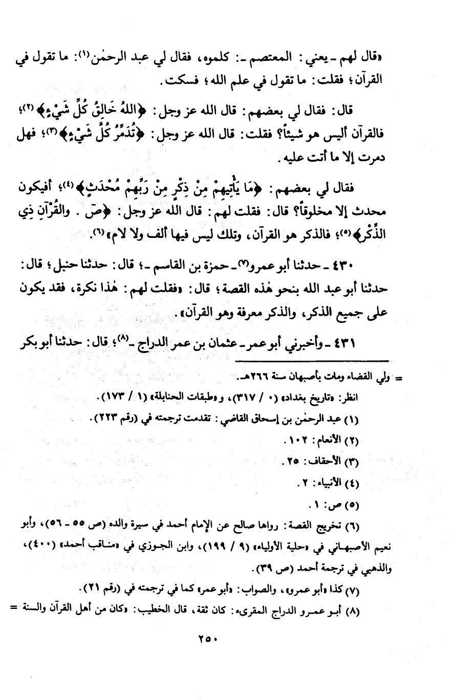 427 - قَالَ أَبُو أَيُّوبَ عَبْدُ الْوَهَّابِ بْنُ عَمْرٍو: وَأَخْبَرَنِي الْعَطَّافُ بْنُ مُسْلِمٍ، عَنْ هَؤُلَاءِ الْمُسْلِمِينَ، فِي صَدْرِ هَذَا الْكِتَابِ، وَعَنْ غَيْرِهِمْ، مِنْ أَصْحَابِ الْمَكِّيِّ: أَنَّ عَبْدَ الْعَزِيزِ، قَالَ: §" اجْتَمَعْتُ مَعَ أَمِيرِ الْمُؤْمِنِينَ بَعْدَ هَذَا الْمَجْلِسِ فَجَرَتْ بَيْنِي وَبَيْنَهُ مُنَاظَرَاتٌ كَثِيرَةٌ، فَقَالَ لِي بَعْدَمَا جَرَى بَيْنَنَا: وَيْحَكَ يَا عَبْدَ الْعَزِيزِ، قُلِ: الْقُرْآنُ مَخْلُوقٌ، فَوَاللَّهِ لَأُوطَأَنَّ الرِّجَالَ عَقَبِكَ، وَلَا نُوهِنُ بِاسْمِكَ، فَإِنْ لَمْ تَقُلْ، فَانْظُرْ مَا يَنْزِلُ بِكَ مِنِّي "، فَقُلْتُ: يَا أَمِيرَ الْمُؤْمِنِينَ إِنَّ الْقُلُوبَ لَا تَرُدُّ بِالرَّغْبَةِ وَلَا بِالرَّهْبَةِ، تُرَغِّبُنِي فَتَقُولُ: قُلْ حَتَّى أَفْعَلَ بِكَ، وَإِنْ لَمْ تَفْعَلْ، انْظُرْ مَاذَا يَنْزِلُ بِكَ مِنِّي، فَيَمِيلُ إِلَيْكَ لِسَانِي وَلَا يَنْطِقُ لَكَ قَلْبِي، فَأَكُونُ قَدْ نَافَقْتُكَ يَا أَمِيرَ الْمُؤْمِنِينَ. فَقَالَ: وَيْحَكَ، فَبِمَاذَا تَرُدُّ الْقُلُوبُ؟ قَالَ: قُلْتُ: بِالْبَصَائِرِ يَا أَمِيرَ الْمُؤْمِنِينَ، بَصِّرْنِي مِنْ أَيْنَ الْقُرْآنُ مَخْلُوقٌ؟. فَقَالَ لِي: صَدَقْتَ