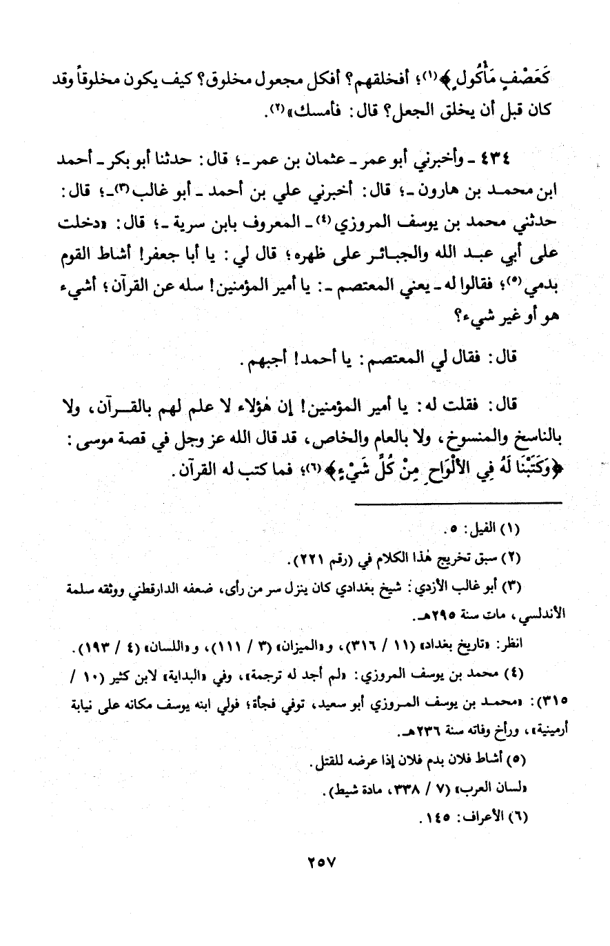 433 - قَالَ حَنْبَلٌ: وَقَالَ أَبُو عَبْدِ اللَّهِ: " وَاحْتَجَجْتُ عَلَيْهِمْ فَقُلْتُ: زَعَمْتُمْ أَنَّ الْأَخْبَارَ تَرُدُّونَهَا بِاخْتِلَافِ أَسَانِيدِهَا، وَمَا يَدْخُلُهَا مِنَ الْوَهْمِ وَالضَّعْفِ، فَهَذَا الْقُرْآنُ نَحْنُ وَأَنْتُمْ مُجْمِعُونَ عَلَيْهِ وَلَيْسَ بَيْنَ أَهْلِ الْقِبْلَةِ فِيهِ خِلَافٌ، وَهُوَ الْإِجْمَاعُ. قَالَ اللَّهُ عَزَّ وَجَلَّ فِي كِتَابِهِ تَصْدِيقًا مِنْهُ لِقَوْلِ إِبْرَاهِيمَ غَيْرَ دَافِعٍ لِمَقَالَتِهِ وَلَا لِمَا حَكَى عَنْهُ فَقَالَ: {إِذْ قَالَ إِبْرَاهِيمُ لِأَبِيهِ يَا أَبَتِ لِمَ تَعْبُدُ مَا لَا يَسْمَعُ وَلَا يُبْصِرُ وَلَا يُغْنِي عَنْكَ شَيْئًا}، فَذَمَّ إِبْرَاهِيمُ أَبَاهُ أَنْ عَبْدَ مَا لَا يَسْمَعُ وَلَا يُبْصِرُ، فَهَذَا مُنْكَرٌ عِنْدَكُمْ ". فَقَالُوا: شِبْهٌ شِبْهٌ يَا أَمِيرَ الْمُؤْمِنِينَ. -[255]- فَقُلْتُ: " أَلَيْسَ هَذَا الْقُرْآنُ؟ هَذَا مُنْكَرٌ عِنْدَكُمْ مَدْفُوعٌ، وَهَذِهِ قِصَّةُ مُوسَى، قَالَ اللَّهُ عَزَّ وَجَلَّ لِمُوسَى فِي كِتَابِهِ حِكَايَةً عَنْ نَفْسِهِ {وَكَلَّمَ اللَّهُ مُوسَى} [النساء: 164]، فَأَثْبَتَ اللَّهُ الْكَلَامَ لِمُوسَى كَرَامَةً مِنْهُ لِمُوسَى، ثُمَّ قَالَ: يَا مُوسَى {إِنَّنِي أَنَا اللَّهُ لَا إِلَهَ إِلَّا أَنَا فَاعَبُدْنِي} [طه: 14]، فَتُنْكِرُونَ هَذَا، فَيَجُوزُ أَنْ يَكُونَ هَذَا الْيَاءُ رَاجِعَةً تَرُدُّ عَلَى غَيْرِ اللَّهِ، أَوْ يَكُونَ مَخْلُوقٌ يَدَّعِي الرُّبُوبِيَّةَ؟ وَهَلْ يَجُوزُ أَنْ يَقُولَ هَذَا غَيْرُ اللَّهِ؟ وَقَالَ لَهُ {يَا مُوسَى لَا تَخَفْ} [النمل: 10]، {إِنِّي أَنَا رَبُّكَ فَاخْلَعْ نَعْلَيْكَ} [طه: 12] " فَهَذَا كِتَابُ اللَّهِ يَا أَمِيرَ الْمُؤْمِنِينَ، فَيَجُوزُ أَنْ يَقُولَ لِمُوسَى: أَنَا رَبُّكُ مَخْلُوقٌ، وَمُوسَى كَانَ يَعْبُدُ مَخْلُوقًا، وَمَضَى إِلَى فِرْعَوْنَ بِرِسَالَةِ مَخْلُوقٍ يَا أَمِيرَ الْمُؤْمِنِينَ؟ قَالَ: فَأَمْسَكُوا، وَأَدَارُوا بَيْنَهُمْ كَلَامًا لَمْ أَفْهَمْهُ. قَالَ أَبُو عَبْدِ اللَّهِ: «وَالْقَوْمُ يَدْفَعُونَ هَذَا وَيُنْكِرُونَهُ، مَا رَأَيْتُ أَحَدًا طَلَبَ الْكَلَامَ وَاشْتَهَاهُ إِلَّا أَخْرَجَهُ إِلَى أَمْرٍ عَظِيمٍ، لَقَدْ تَكَلَّمُوا بِكَلَامٍ، وَاحْتَجُّوا بِشَيْءٍ مَا يَقْوى قَلْبِي وَلَا يَنْطِقُ لِسَانِي أَنْ أَحْكِيَهُ، وَالْقَوْمُ يَرْجِعُونَ إِلَى التَّعْطِيلِ فِي أَقَاوِيلِهِمْ، وَيُنْكِرُونَ الرُّؤْيَةَ وَالْآثَارَ كُلَّهَا، مَا ظَنَنْتُ أَنَّهُ هَكَذَا حَتَّى سَمِعْتُ مَقَالَاتِهِمْ» قَالَ أَبُو عَبْدِ اللَّهِ: " قِيلَ لِي يَوْمَئِذٍ: كَانَ اللَّهُ وَلَا قُرْآنَ. فَقُلْتُ لَهُ: كَانَ اللَّهُ -[256]- وَلَا عِلْمَ؟ فَأَمْسَكَ، وَلَوْ زَعَمَ غَيْرَ ذَلِكَ أَنَّ اللَّهَ كَانَ وَلَا عِلْمَ، لَكَفَرَ بِاللَّهِ " قَالَ أَبُو عَبْدِ اللَّهِ: " وَقُلْتُ لَهُ يَعْنِي: لِابْنِ الْحَجَّامِ: يَا وَيْلَكَ، لَا يَعْلَمُ حَتَّى يَكُونَ فَعِلْمُهُ وَعِلْمُكَ وَاحِدٌ، كَفَرْتَ بِاللَّهِ عَالِمِ السِّرِّ وَأَخْفَى، عَالِمِ الْغَيْبِ وَالشَّهَادَةِ، عَلَّامِ الْغُيُوبِ، وَيْلَكَ، يَكُونُ عِلْمُهُ مِثْلَ عِلْمِكَ، تَعْلَمُ خَائِنَةَ الْأَعْيُنِ وَمَا تُخْفِي الصُّدُورُ " قَالَ أَبُو عَبْدِ اللَّهِ: «فَهَذِهِ أَلَيْسَتْ مَقَالَتُهُ؟» قَالَ أَبُو عَبْدِ اللَّهِ: " وَهَذَا هُوَ الْكُفْرُ بِاللَّهِ، مَا ظَنَنْتُ أَنَّ الْقَوْمَ هَكَذَا. لَقَدْ جَعَلَ بُرْغُوثٌ يَقُولُ يَوْمَئِذٍ: الْجِسْمُ وَكَذَا وَكَلَامٌ لَا أَفْهَمُهُ، فَقُلْتُ: لَا أَعْرِفُ وَلَا أَدْرِي مَا هَذَا، إِلَّا أَنَّنِي أَعْلَمُ أَنَّهُ أَحَدٌ صَمَدٌ، لَا شِبْهَ لَهُ وَلَا عِدْلَ، وَهُوَ كَمَا وَصَفَ نَفْسَهُ، فَيَسْكُتُ عَنِّي " قَالَ: فَقَالَ لِي شُعَيْبٌ: قَالَ الل