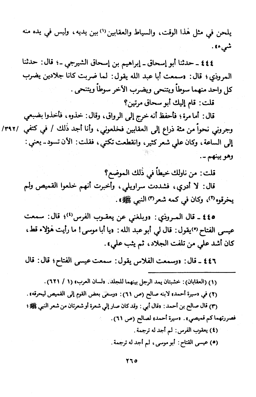 438 - وَأَخْبَرَنِي أَبُو عَمْرٍو عُثْمَانُ بْنُ عُمَرَ، قَالَ: حَدَّثَنَا أَحْمَدُ بْنُ مُحَمَّدِ بْنِ هَارُونَ، قَالَ: وَكَتَبَ إِلَيَّ أَحْمَدُ بْنُ الْحُسَيْنِ الْوَرَّاقُ مِنَ الْمَوْصِلِ قَالَ: حَدَّثَنَا بَكْرُ بْنُ مُحَمَّدٍ، عَنْ أَبِيهِ، عَنْ أَبِي عَبْدِ اللَّهِ، قَالَ: " §وَاجْتَمَعَ عَلَيَّ خَلْقٌ مِنَ الْخَلْقِ، وَأَنَا بَيْنَهُمْ مِثْلُ الْأَسِيرِ، وَتِلْكَ الْقُيُودُ قَدْ أَثْقَلَتْنِي، قَالَ: وَكَانَ يَلْغَطُونَ وَيَضْحَكُونَ، وَكُلُّ وَاحِدٍ مِنْهُمْ يَنْزِعُ آيَةً، وَآخَرُ يَجِئُ بِحَدِيثٍ قَالَ: وَالرَّئِيسُ يُسْكِتُهُمْ، قَالَ: فَكَانَ هَذَا يَقُولُ شَيْئًا، وَهَذَا يَقُولُ شَيْئًا، وَهَذَا يَقُولُ شَيْئًا، فَقَالَ لِي وَاحِدٌ مِنْهُمْ: أَلَيْسَ يُرْوَى عَنْ أَبِي السَّلِيلِ، عَنْ عَبْدِ اللَّهِ بْنِ رَبَاحٍ، عَنْ أَبِي كَعْبٍ؟ فَقُلْتُ: «وَأَنْتَ مَا يُدْرِيكَ مَنْ أَبُو السَّلِيلِ؟ وَمَنْ عَبْدِ اللَّهِ بْنُ رَبَاحٍ؟ وَمَا لَكَ وَلِهَذَا؟» قَالَ: فَسَكَتَ وَقَالَ لِي آخَرُ: مَا خَلَقَ اللَّهُ مِنْ سَمَاءٍ وَلَا أَرْضٍ أَعْظَمَ مِنْ آيَةِ الْكُرْسِيِّ، فَقُلْتُ: إِنَّمَا هَذَا مَثَلٌ فَسَكَتَ. وَاحْتَجَّ عَلَيَّ آخَرُ بِحَدِيثِ الطَّنَافِسِيِّ، عَنِ الْأَعْمَشِ، عَنْ جَامِعِ حَدِيثِ عِمْرَانَ -[262]- بْنِ حُصَيْنٍ أَنَّ اللَّهَ خَلَقَ الذِّكْرَ. فَقُلْتُ: هَذَا وَهَمَ فِيهِ يَعْنِي الطَّنَافِسِيَّ، وَأَبُو مُعَاوِيَةَ يَقُولُ: كَتَبَ اللَّهُ الذِّكْرَ. قَالَ: وَكُنْتُ أَصِيحُ عَلَيْهِمْ، وَأَرْفَعَ صَوْتِي، وَكَانَ أَهْوَنَ عَلَيَّ مِنْ كَذَا وَكَذَا، ذَهَبَ اللَّهُ بِالرُّعْبِ مِنْ قَلْبِي، حَتَّى لَمْ أَكُنْ أُبَالِي بِهِمْ وَلَا أَهَابُهُمْ، فَلَمَّا يَئِسُوا مِنِّي وَاجْتَمَعُوا عَلَيَّ، قَالَ لِي عَبْدُ الرَّحْمَنِ: مَا رَأَيْتُ مِثْلَكَ قَطُّ، مَنْ صَنَعَ مَا صَنَعْتَ؟ قُلْتُ لَهُ: الْقُرْآنُ، قَدِ اجْتَمَعْتُ أَنَا وَأَنْتُمْ عَلَى أَنَّهُ كَلَامُ اللَّهِ، وَزَعَمْتُمْ أَنَّهُ مَخْلُوقٌ، فَهَاتُوهُ مِنْ كِتَابٍ أَوْ سُنَّةٍ، فَقَالَ لِيَ ابْنُ أَبِي دُؤَادٍ: وَأَنْتَ تَجِدُ فِي كُلِّ شَيْءٍ كِتَابًا وَسُنَّةً؟ فَلَمَّا يَئِسَ مِنِّي قَالَ: خُذُوهُ، وَأَدْخَلَ الْأَتْرَاكُ أَيْدِيَهُمْ فِي أَقْيَادِي فَجَرُّونِي إِلَى مَوْضِعٍ بَعِيدٍ، وَذَكَرَ قِصَّةَ الضَّرْبِ