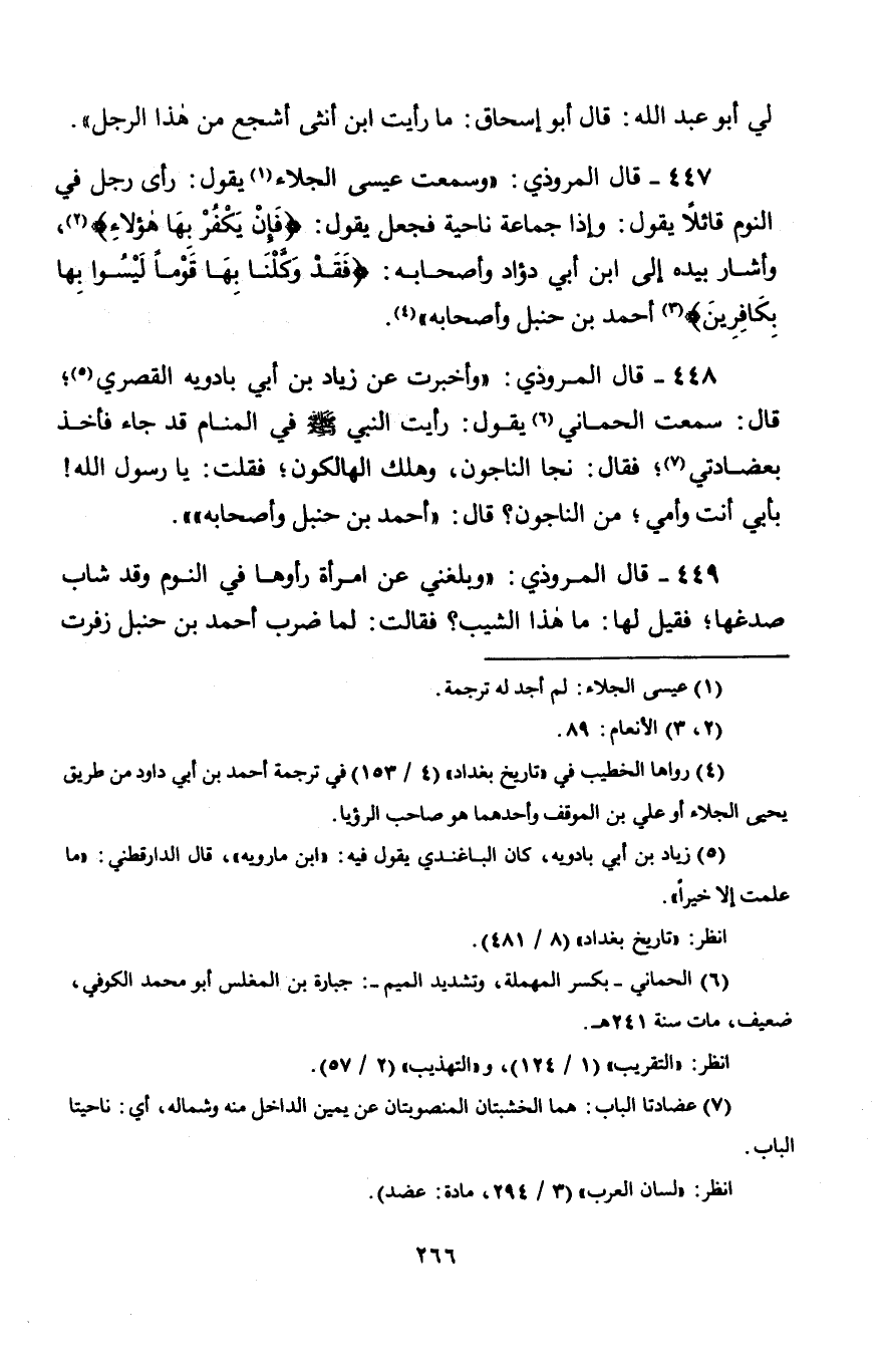 439 - وَأَخْبَرَنِي أَبُو عَمْرٍو عُثْمَانُ بْنُ عُمَرَ قَالَ: حَدَّثَنَا أَحْمَدُ بْنُ مُحَمَّدِ بْنِ هَارُونَ، قَالَ: وَأَخْبَرَنَا أَحْمَدُ بْنُ مُحَمَّدِ بْنِ عَبْدِ الْحَمِيدِ الْكُوفِيُّ، قَالَ: سَمِعْتُ عُبَيْدَ بْنَ مُحَمَّدٍ الْقَصِيرَ، قَالَ: سَمِعْتُ مَنْ حَضَرَ مَجْلِسَ أَبِي إِسْحَاقَ يَوْمَ ضَرَبَ أَحْمَدَ بْنَ حَنْبَلٍ، فَقَالَ لَهُ أَبُو إِسْحَاقَ: §يَا أَحْمَدُ إِنْ كُنْتَ -[263]- تَخْشَى مِنْ هَؤُلَاءِ النَّابِتَةِ جِئْتُكَ أَنَا فِي جَيْشِي إِلَى بَيْتِكَ حَتَّى أَسْمَعَ مِنْكَ الْحَدِيثَ؟ قَالَ: فَقَالَ لَهُ: «يَا أَمِيرَ الْمُؤْمِنِينَ خُذْ فِي غَيْرِ هَذَا وَاسْأَلْ عَنِ الْعِلْمِ وَاسْأَلْ عَنِ الْفِقْهِ، أَيُّ شَيْءٍ تَسْأَلُ عَنْ هَذَا؟» قَالَ عُبَيْدُ بْنُ مُحَمَّدٍ: وَسَمِعْتُ مَنْ حَضَرَ مَجْلِسَ أَبِي إِسْحَاقَ يَوْمَ ضَرَبَ أَحْمَدَ بْنَ حَنْبَلٍ قَالَ: " الْتَفَتَ إِلَيْهِ الْمُعْتَصِمُ، فَقَالَ: تَعْرِفُ هَذَا؟ قَالَ: لَا. قَالَ تَعْرِفُ هَذَا؟ قَالَ: لَا. فَالْتَفَتَ أَحْمَدُ فَوَقَعَتْ عَيْنُهُ عَلَى ابْنِ أَبِي دُؤَادٍ فَحَوَّلَ وَجْهَهُ، فَكَأَنَّمَا وَقَعَتْ عَيْنُهُ عَلَى قِرْدٍ، قَالَ: تَعْرِفُ هَذَا يَعْنِي: عَبْدَ الرَّحْمَنِ؟ قَالَ: نَعَمْ. قَالَ: قُلِ: اللَّهُ رَبُّ الْقُرْآنِ؟ قَالَ: الْقُرْآنُ كَلَامُ اللَّهِ. قَالَ: فَشَهِدَ ابْنُ سَمَاعَةَ وَقَتَلَتُهُ، فَقَالُوا: قَدْ كَفَرَ، اقْتُلْهُ وَدَمُهُ فِي أَعْنَاقِنَا "