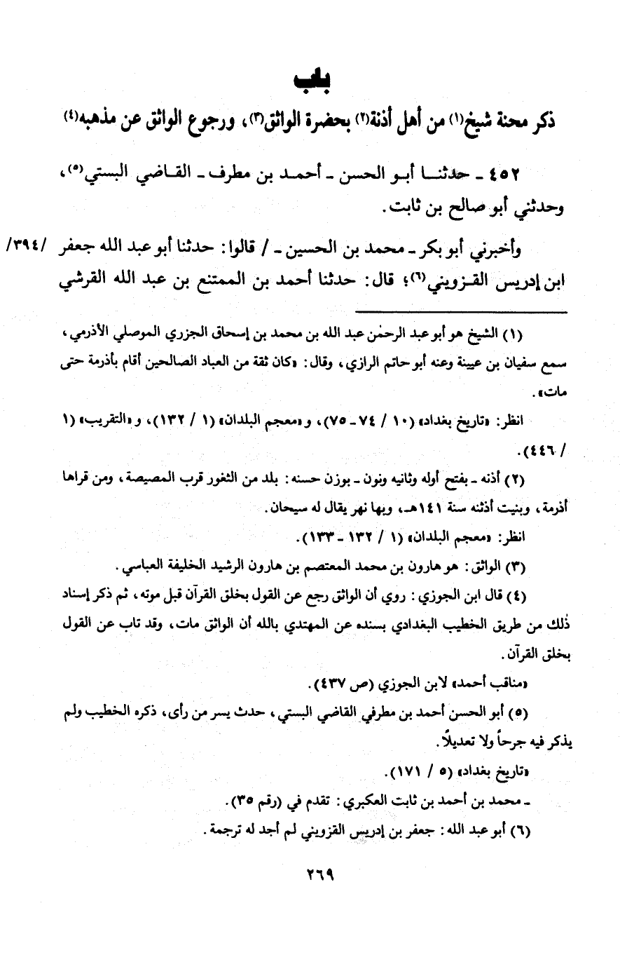 444 - حَدَّثَنَا أَبُو إِسْحَاقَ إِبْرَاهِيمُ بْنُ إِسْحَاقَ الشِّيرَجِيُّ، قَالَ: حَدَّثَنَا الْمَرُّوذِيُّ، قَالَ: سَمِعْتُ أَبَا عَبْدِ اللَّهِ، يَقُولُ: «لَمَّا ضُرِبْتُ كَانَا جَلَّادَيْنِ يَضْرِبُ كُلُّ وَاحِدٍ مِنْهُمَا سَوْطًا وَيَتَنَحَّى وَيَضْرِبُ الْآخَرُ سَوْطًا وَيَتَنَحَّى». قُلْتُ: قَامَ إِلَيْكَ أَبُو إِسْحَاقَ مَرَّتَيْنِ؟ قَالَ: " أَمَّا مَرَّةً، فَأَحْفَظُ أَنَّهُ خَرَجَ إِلَى الرِّوَاقِ، وَقَالَ: خُذُوهُ، §فَأَخَذُوا بِضُبُعَيَّ وَجَرُّونِي نَحْوًا مِنْ مِائَةِ ذِرَاعٍ إِلَى الْعَقَابِينِ فَخَلَّعُونِي، وَأَنَا أَجِدُ ذَلِكَ فِي كَتِفَيَّ إِلَى السَّاعَةِ، وَكَانَ عَلَيَّ شَعْرٌ كَثِيرٌ، وَانْقَطَعَتْ تِكَّتِي، فَقُلْتُ: الْآنَ تَسُودُ، يَعْنِي: وَهُوَ بَيْنَهُمْ، قُلْتُ: مَنْ نَاوَلَكَ خَيْطًا فِي ذَلِكَ الْمَوْضِعِ؟ قَالَ: لَا أَدْرِي، فَشَدَدْتُ سَرَاوِيلِي، وَأُخْبِرْتُ أَنَّهُمْ خَلَعُوا الْقَمِيصَ وَلَمْ يَخْرِقُوهُ، وَكَانَ فِي كُمِّهِ شَعْرُ النَّبِيِّ صَلَّى اللَّهُ عَلَيْهِ وَسَلَّمَ "