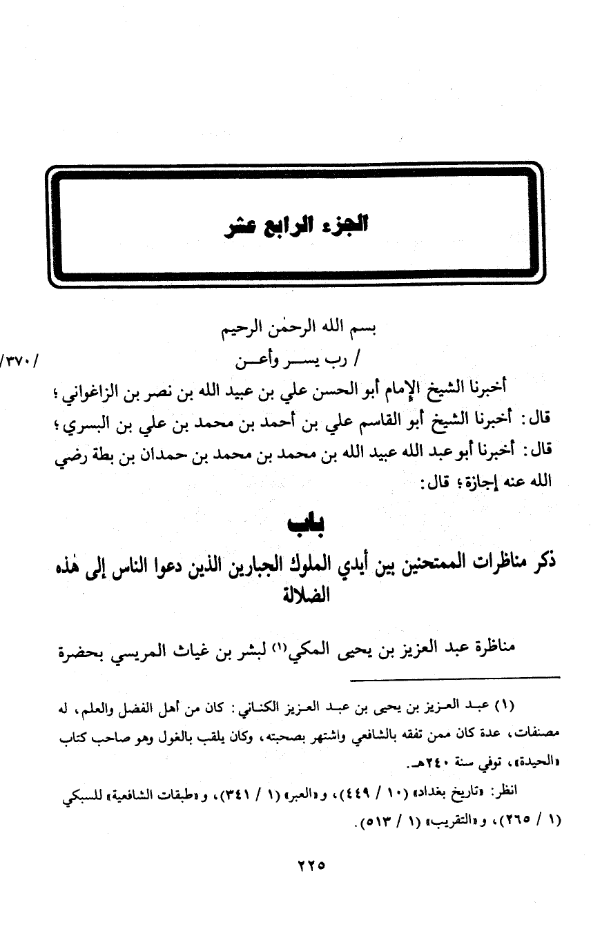 452 - حَدَّثَنَا أَبُو الْحَسَنِ أَحْمَدُ بْنُ مُطَرِّفٍ الْقَاضِي الْبِسْتِيُّ، وَحَدَّثَنِي أَبُو صَالِحِ بْنُ ثَابِتٍ، وَأَخْبَرَنِي أَبُو بَكْرٍ مُحَمَّدُ بْنُ الْحَسَنِ، قَالُوا: حَدَّثَنَا أَبُو عَبْدِ اللَّهِ جَعْفَرُ بْنُ إِدْرِيسَ الْقَزْوِينِيُّ، قَالَ: حَدَّثَنَا أَحْمَدُ بْنُ الْمُمْتَنِعِ بْنِ عَبْدِ اللَّهِ الْقُرَشِيُّ -[270]- التَّيْمِيُّ، قَالَ: أَخْبَرَنَا أَبُو الْفَضْلِ صَالِحُ بْنُ عَلِيِّ بْنِ يَعْقُوبَ بْنِ الْمَنْصُورِ الْهَاشِمِيُّ، وَكَانَ مِنْ وُجُوهِ بَنِي هَاشِمٍ وَأَهْلِ الْجَلَالَةِ وَالسِّنِّ مِنْهُمْ، قَالَ: §حَضَرْتُ الْمُهْتَدِي بِاللَّهِ أَمِيرَ الْمُؤْمِنِينَ رَحْمَةُ اللَّهِ عَلَيْهِ وَقَدْ جَلَسَ يَنْظُرُ فِي أُمُورِ الْمُسْلِمِينَ فِي دَارِ الْعَامَّةِ، فَنَظَرْتُ إِلَى قِصَصِ النَّاسِ تُقْرَأُ عَلَيْهِ مِنْ أَوَّلِهَا إِلَى آخِرِهَا فَيَأْمُرُنَا بِالتَّوْقِيعِ فِيهَا وَإِنْشَاءِ الْكُتُبِ لِأَصْحَابِهَا، وَتُخْتَمُ وَتُدْفَعُ إِلَى صَاحِبِهِ بَيْنَ يَدَيْهِ، فَيَسُرُّنِي ذَلِكَ، وَجَعَلْتُ أَنْظُرُ إِلَيْهِ فَفَطِنَ وَنَظَرَ إِلَيَّ، فَغَضَضْتُ عَنْهُ حَتَّى كَانَ ذَلِكَ مِنِّي وَمِنْهُ مِرَارًا ثَلَاثًا، إِذَا نَظَرَ إِلَيَّ غَضَضْتُ وَإِذَا اشْتَغَلَ نَظَرْتُ، فَقَالَ لِي: يَا صَالِحُ قُلْتُ: لَبَّيْكَ يَا أَمِيرَ الْمُؤْمِنِينَ، وَقُمْتُ قَائِمًا، فَقَالَ: فِي نَفْسِكَ مِنَّا شَيْءٌ تُحِبُّ أَنْ تَقُولَهُ، أَوْ قَالَ: تُحِبُّ أَنْ تَقُولَهُ؟ قُلْتُ: نَعَمْ يَا سَيِّدِي يَا أَمِيرَ الْمُؤْمِنِينَ، فَقَالَ: عُدْ إِلَى مَوْضِعِكَ، فَعُدْتُ. وَعَادَ فِي النَّظَرِ حَتَّى إِذَا قَامَ قَالَ لِلْحَاجِبِ: لَا يَبْرَحْ صَالِحٌ فَانْصَرَفَ النَّاسُ، ثُمَّ أَذِنَ لِي وَقَدْ هَمَّتْنِي نَفْسِي، فَدَخَلْتُ دَعَوْتُ لَهُ، فَقَالَ لِيَ: «اجْلِسْ» فَجَلَسْتُ، فَقَالَ: «يَا صَالِحُ تَقُولُ لِي مَا دَارَ فِي نَفْسِكَ أَوْ أَقُولُ أَنَا مَا دَارَ فِي نَفْسِكَ -[271]- أَنَّهُ دَارَ فِي نَفْسِكَ؟» قُلْتُ: يَا أَمِيرَ الْمُؤْمِنِينَ مَا تَعْزِمُ عَلَيْهِ وَمَا تَأْمُرُ بِهِ؟ فَقَالَ: «وَأَقُولُ أَنَا، كَأَنِّي بِكَ وَقَدِ اسْتَحْسَنْتَ مَا رَأَيْتَ مِنَّا»، فَقُلْتَ: أَيُّ خَلِيفَةٍ خَلِيفَتُنَا إِنْ لَمْ يَكُنْ يَقُولُ: الْقُرْآنُ مَخْلُوقٌ، فَوَرَدَ عَلَى قَلْبِي أَمْرٌ عَظِيمٌ، وَهَمَّتْنِي نَفْسِي، ثُمَّ قُلْتُ: يَا نَفْسُ هَلْ تَمُوتِينَ إِلَّا مَرَّةً وَاحِدَةً، وَهَلْ تَمُوتِينَ قَبْلَ أَجَلِكِ، وَهَلْ يَجُوزُ الْكَذِبَ فِي جِدٍّ أَوْ هَزْلٍ، فَقُلْتُ: وَاللَّهِ يَا أَمِيرَ الْمُؤْمِنِينَ مَا دَارَ فِي نَفْسِي إِلَّا مَا قُلْتَ، أَطْرَقَ مَلِيًّا، ثُمَّ قَالَ: " وَيْحَكَ، اسْمَعْ مِنِّي مَا أَقُولُ لَكَ، فَوَاللَّهِ لَتَسْمَعَنَّ الْحَقَّ، فَسُرِّيَ عَنِّي وَقُلْتُ: يَا سَيِّدِي وَمَنْ أَوْلَى بِالْحَقِّ مِنْكَ وَأَنْتَ خَلِيفَةُ رَبِّ الْعَالَمِينَ، وَابْنُ عَمِّ سَيِّدِ الْمُرْسَلِينَ مِنَ الْأَوَّلِينَ وَالْآخِرِينَ؟ فَقَالَ لِي: " مَا زِلْتُ أَقُولُ إِنَّ الْقُرْآنَ مَخْلُوقٌ صَدْرًا مِنْ خِلَافَةِ الْوَاثِقِ حَتَّى أَقْدَمَ عَلَيْنَا ابْنُ أَبِي دُؤَادٍ شَيْخًا مِنْ أَهْلِ الشَّامِ مِنْ أَهْلِ أَذَنَةَ، فَأُدْخِلَ الشَّيْخُ عَلَى الْوَاثِقِ وَهُوَ جَمِيلُ الْوَجْهِ، تَامُّ الْقَامَةِ، حَسَنُ الشَّيْبَةِ، فَرَأَيْتُ الْوَاثِقَ قَدِ اسْتَحْيَا مِنْهُ وَرَقَّ لَهُ، فَمَا زَالَ يُدْنِيهِ وَيُقَرِّبُهُ حَتَّى قُرِّبَ مِنْهُ، فَسَلَّمَ الشَّيْخُ فَأَحْسَنَ السَّلَامَ، وَدَعَا فَأَبْلَغَ وَأَوْجَزَ، فَقَالَ لَهُ الْوَاثِقُ: اجْلِسْ، ثُمَّ قَالَ لَهُ: «يَا شَيْخُ نَاظِرِ ابْنَ أَبِي دُؤَادٍ عَلَى مَا يُنَاظِرُكَ عَلَيْهِ»، فَقَالَ ا